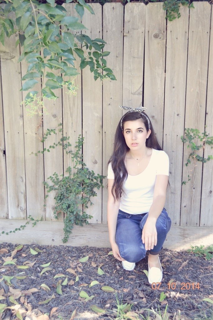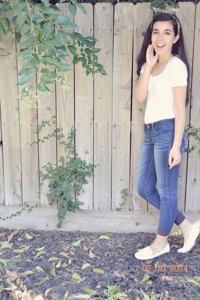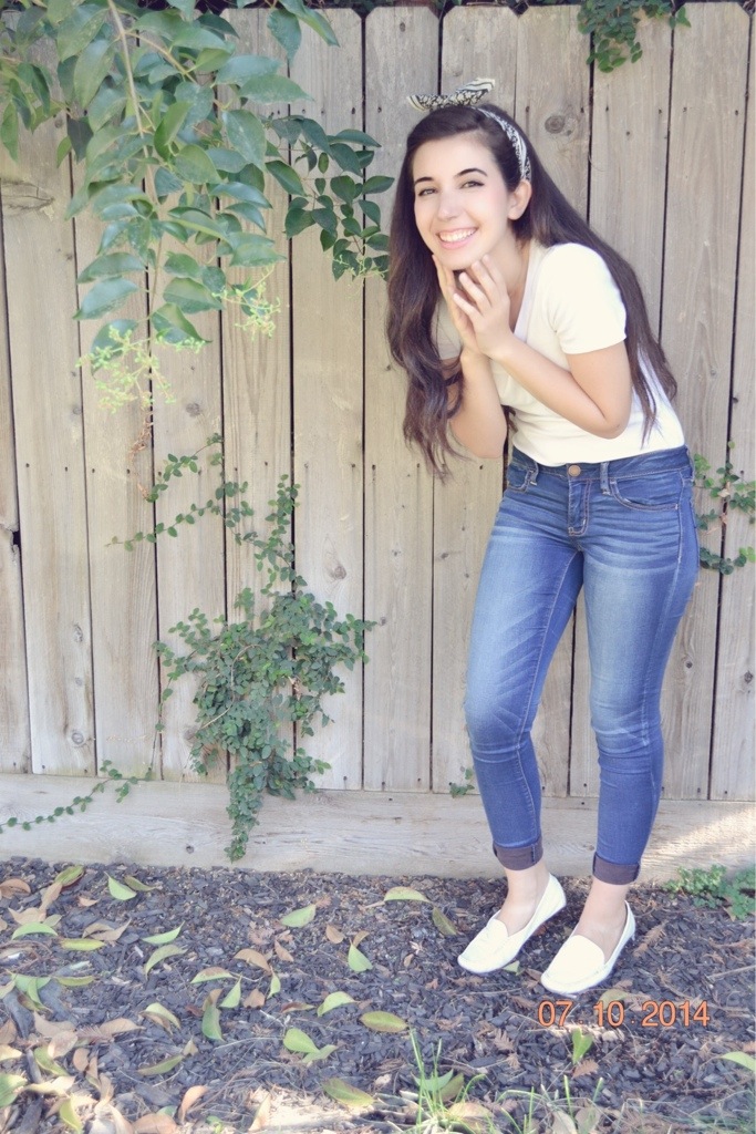 My blue #JEGGINGS–I know, not technically jeans–are from American Eagle! They are super comfortable and look even cuter cuffed! For my white Tshirt, I went with a deep, round neck from Target! My white loafers add that extra retro flair this outfit needs to make Dean proud! To add some extra spice to the outfit, I wore a white silk scarf as a headband and my favorite california necklace to show not only some love for my country, but my state too!