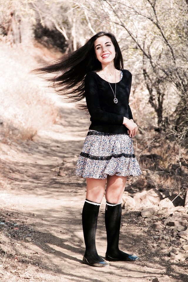 In the spirit of a new season, I am wearing my floral summer dress that I just couldn’t put away under my basic black sweater! In order to stay warmer and add more interest to the outfit, I put on my adorable frilly black knee high socks and paired them with some black flats, can you say, Blair Waldorf?