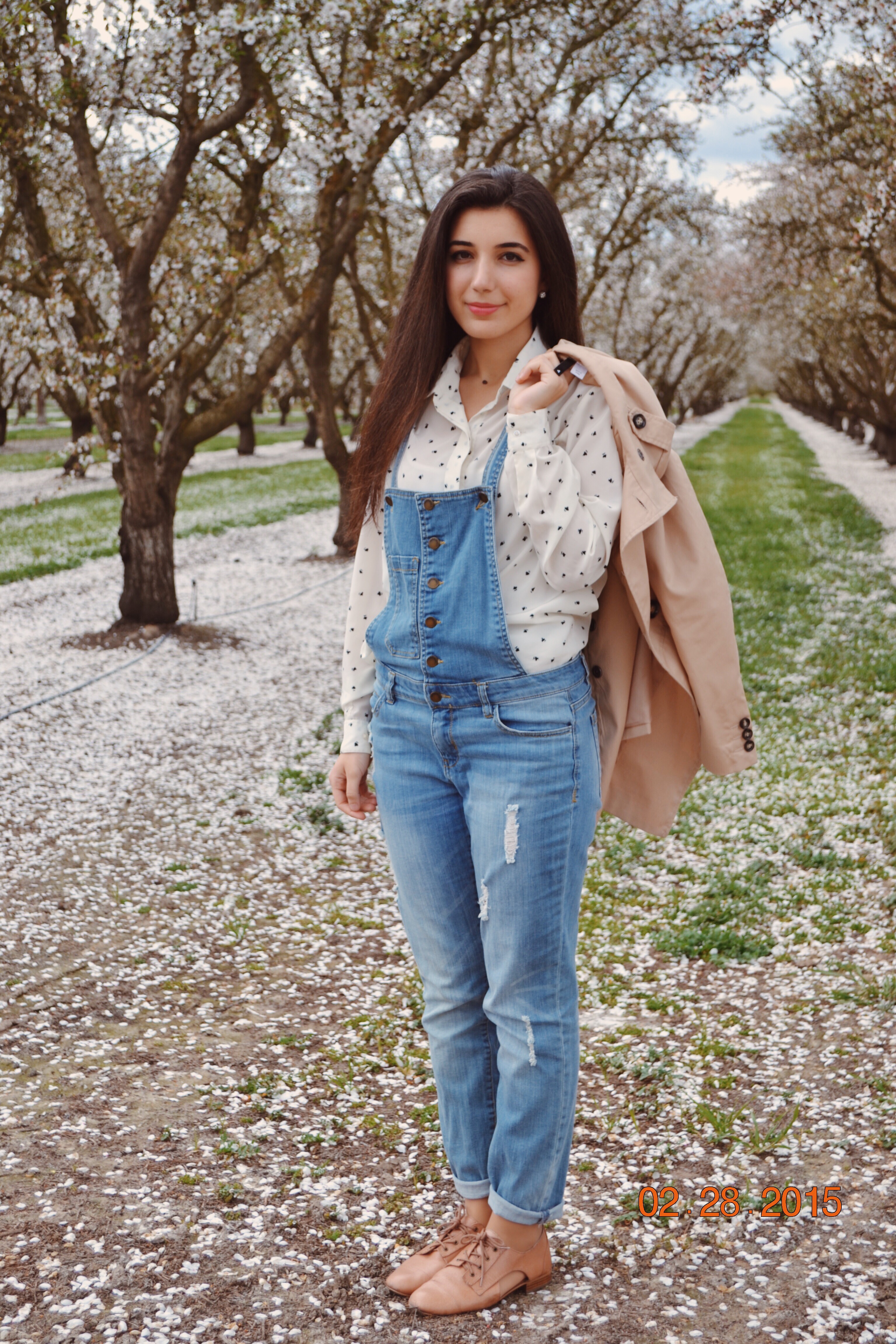 The beautiful bounty of blossoms only makes me anticipate the season of Spring. While it may not be my favorite season, it is a wonderful one all the same, especially for fashion. I love the color black, but Spring is a time for me to break out of my comfort zone and turn to more cheerful colors such as pastels and whites. I also begin to put away the dark lipstick and turn to pinks. This outfit is a prime example of the types of outfits I will be frequently seen in this season. I am all for delicate blouses, like the one I am wearing here that has a gorgeous black bird pattern on it. While the blouse is a statement piece on its own, I love mixing statement pieces with statement pieces. These light wash overalls pair really well with the blouse and look great cuffed on the bottom. Pair them with some light brown oxfords and a lightweight trench coat to stay warm and stylish.