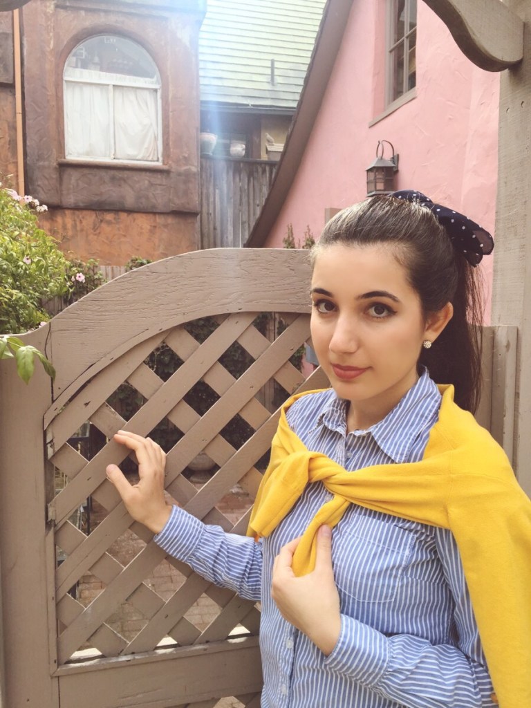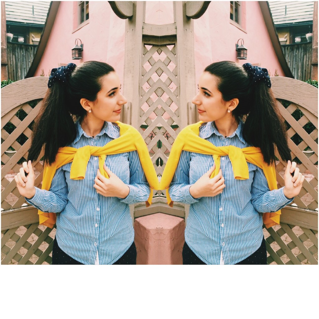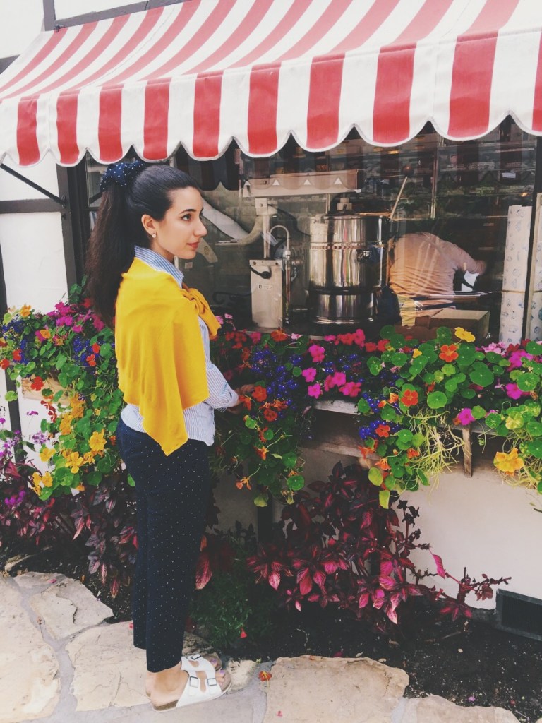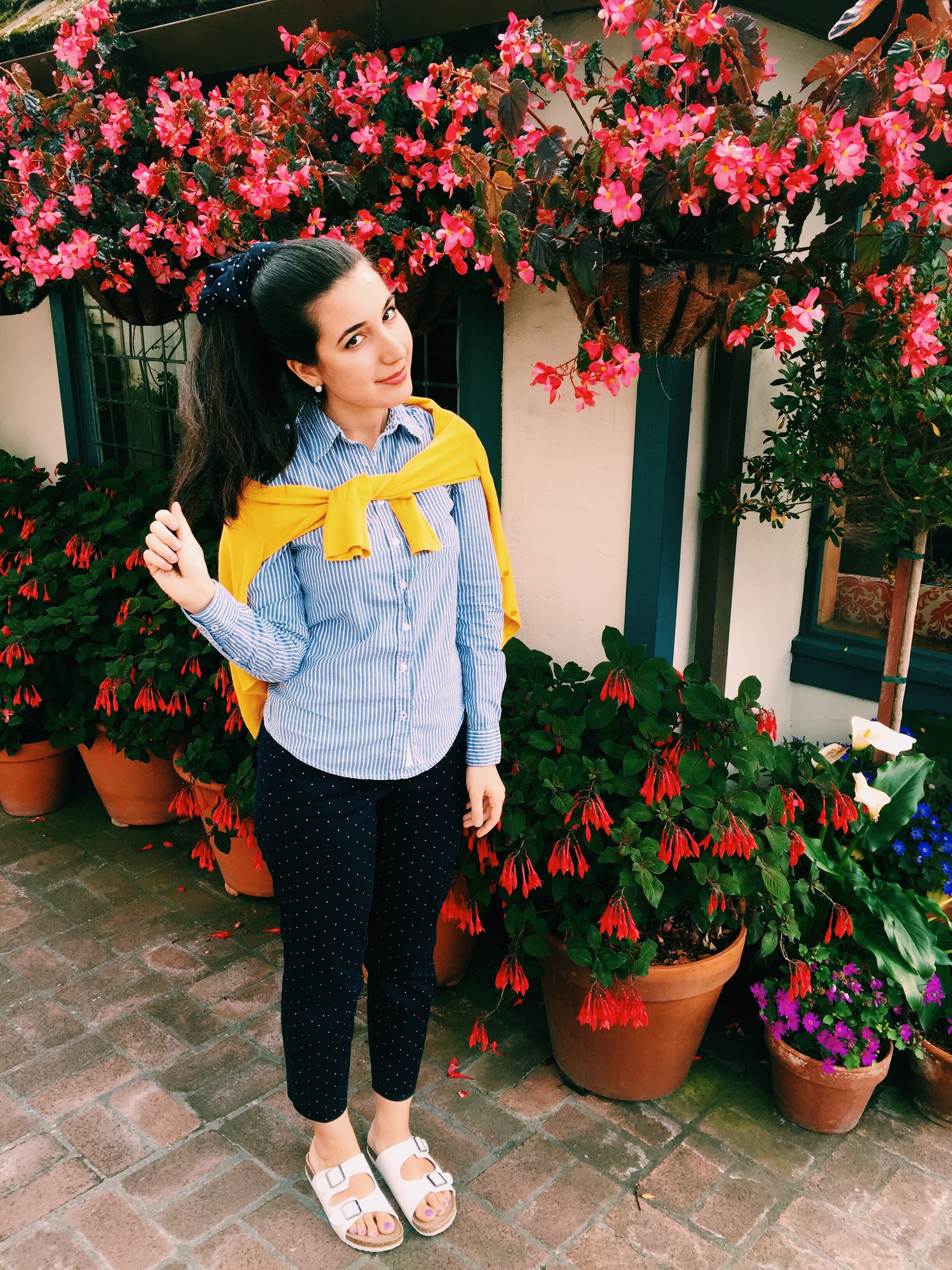 I had the opportunity to engage in these things once more: grandma garb (or just super trendy?) and all. To pull off this look, I wore a vertical striped blue button down with some navy polka-dot trousers. Since the dots are microscopic, the patterns don’t get too busy, especially when the two hues exist in the same color scheme. To continue the preppy look, I sported a yellow cardigan tied around the shoulders as well as a polka-dot scarf that matched my pants. Lastly, I wore some white not-quite-Birkenstock Birkenstocks to tie everything together.