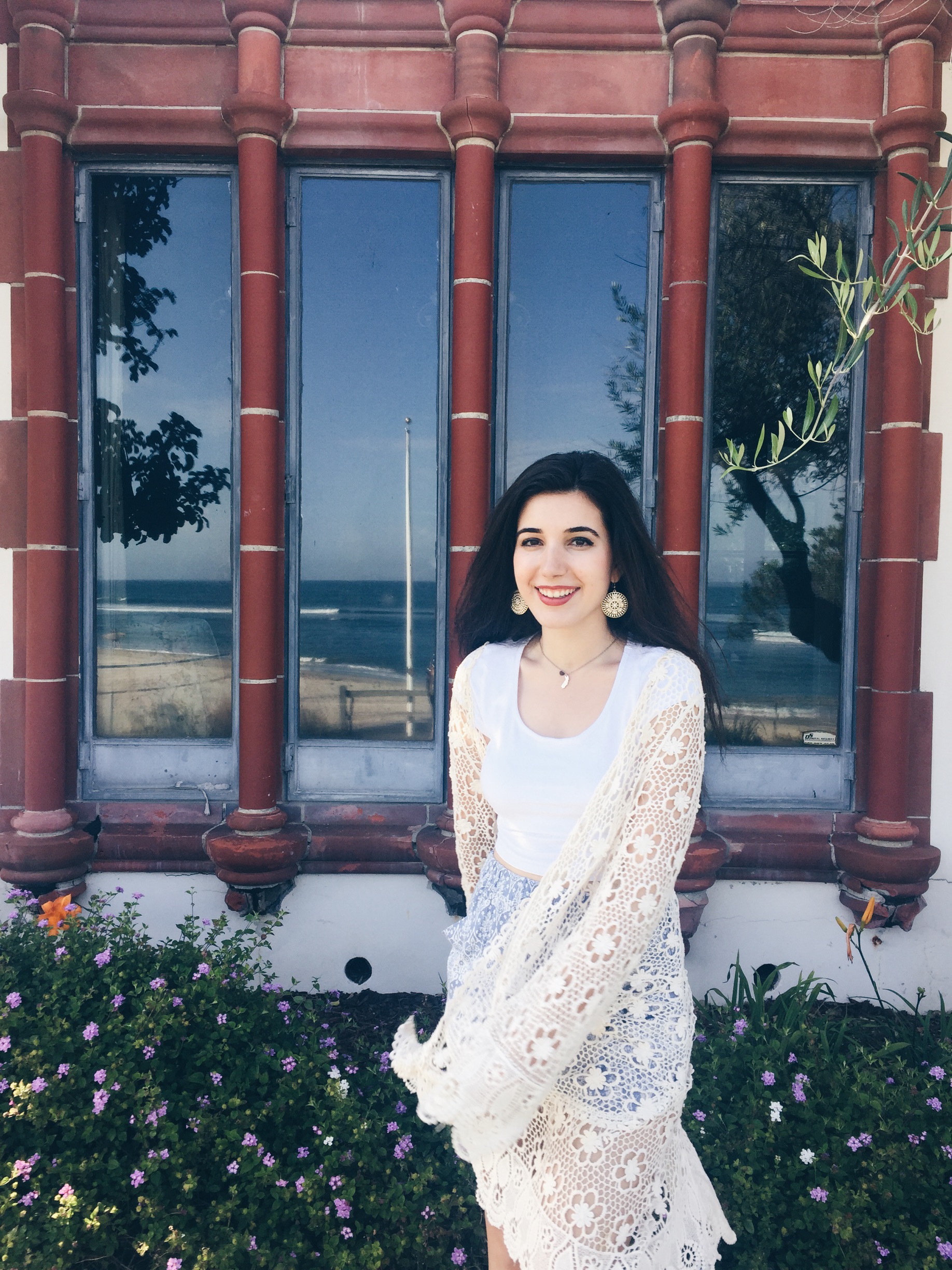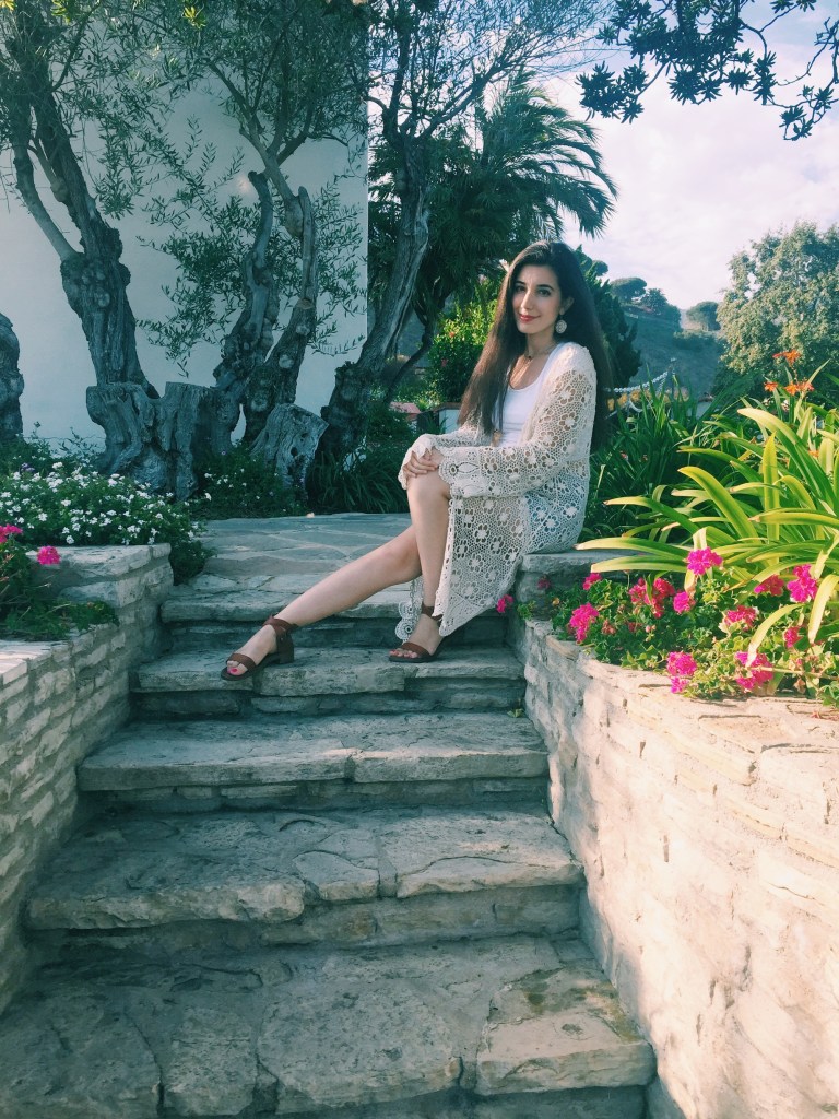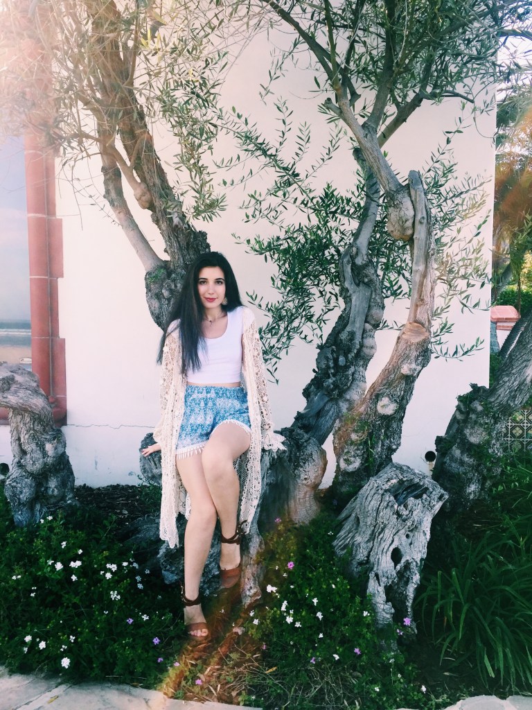 One does not go to Malibu without wearing in the ‘Bu beach basics. The Malibu uniform does not exclude a white crop top and blue patterned shorts with some cream embellishments. Since it became a little chilly, I paired the look with a cream crochet cardigan that picks up on the short’s embellishments. For footwear, I opted for my favorite/reliable brown sandals. To top it all off, I decided to switch out my daily studs for some dangly cream earrings that have diamond-looking detailing.