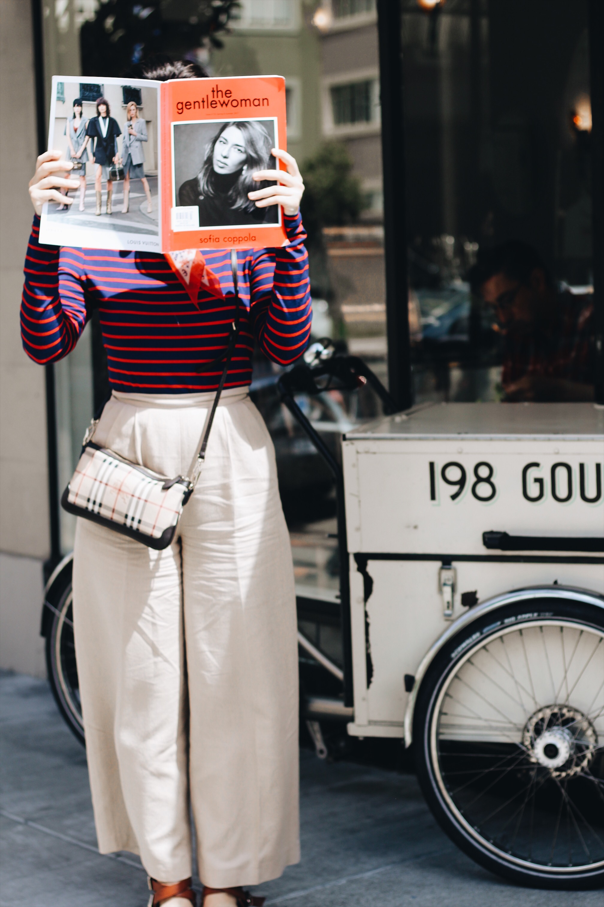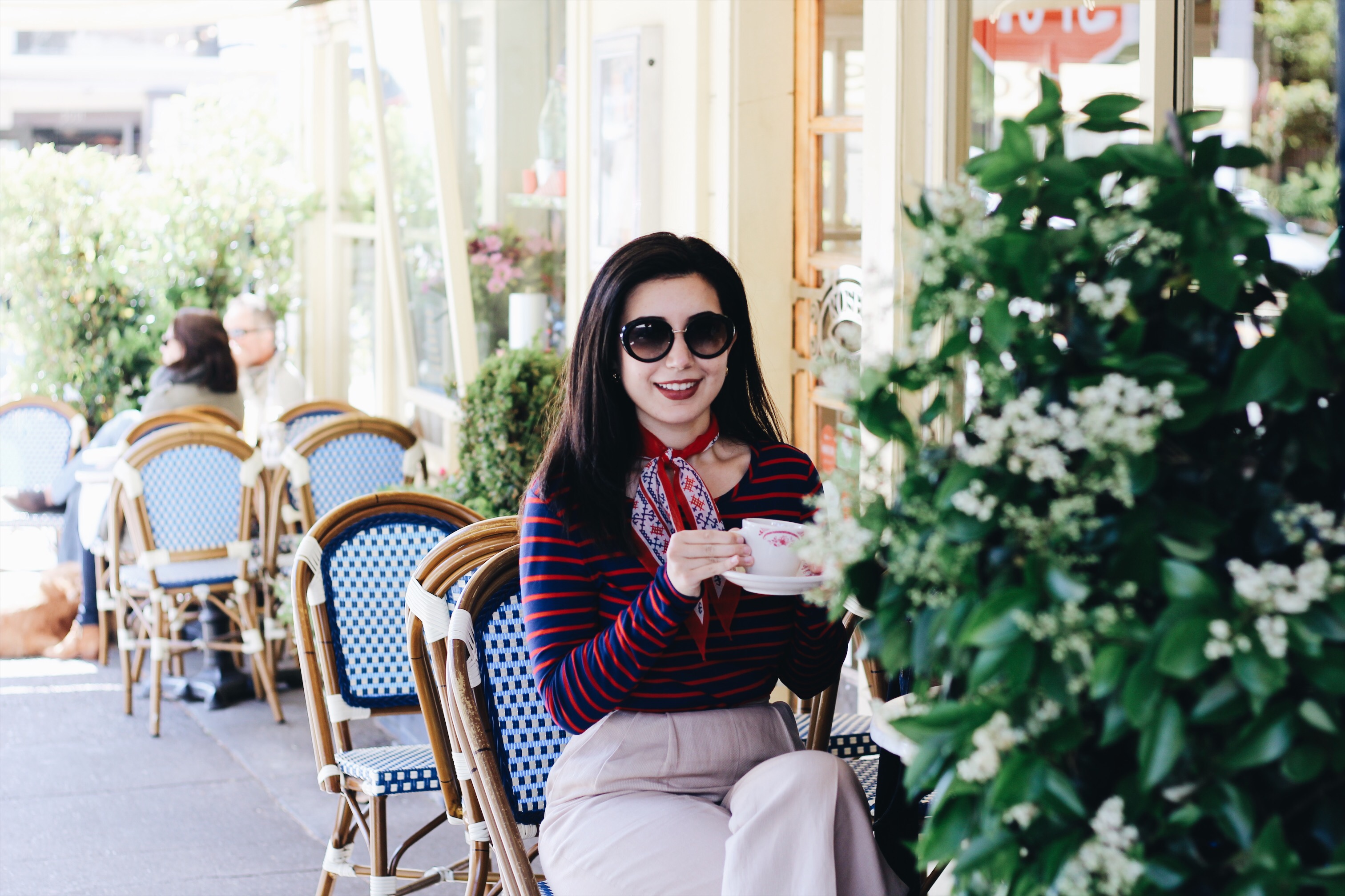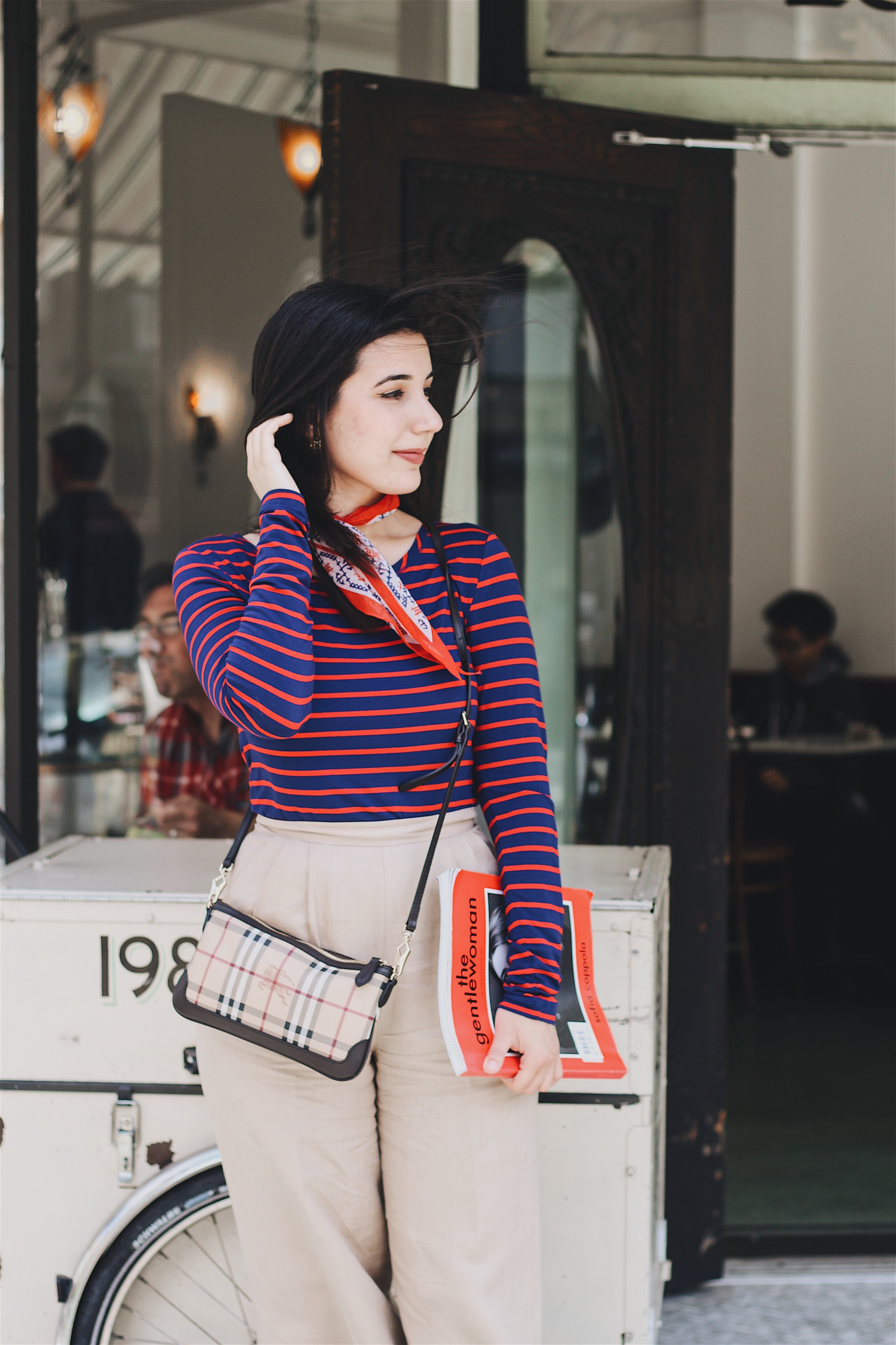 To fit into my antique European corner of the world, I am wearing some high-waist beige trousers with gorgeous pleating and a navy and red nautical shirt. To add some Parisian flair, I opted for an ascot in the same color palette of my shirt. If you cannot tell by my Instagram and a previous blog post, I’m totally not addicted to necktie scarves… I also didn’t match my outfit to my magazine…