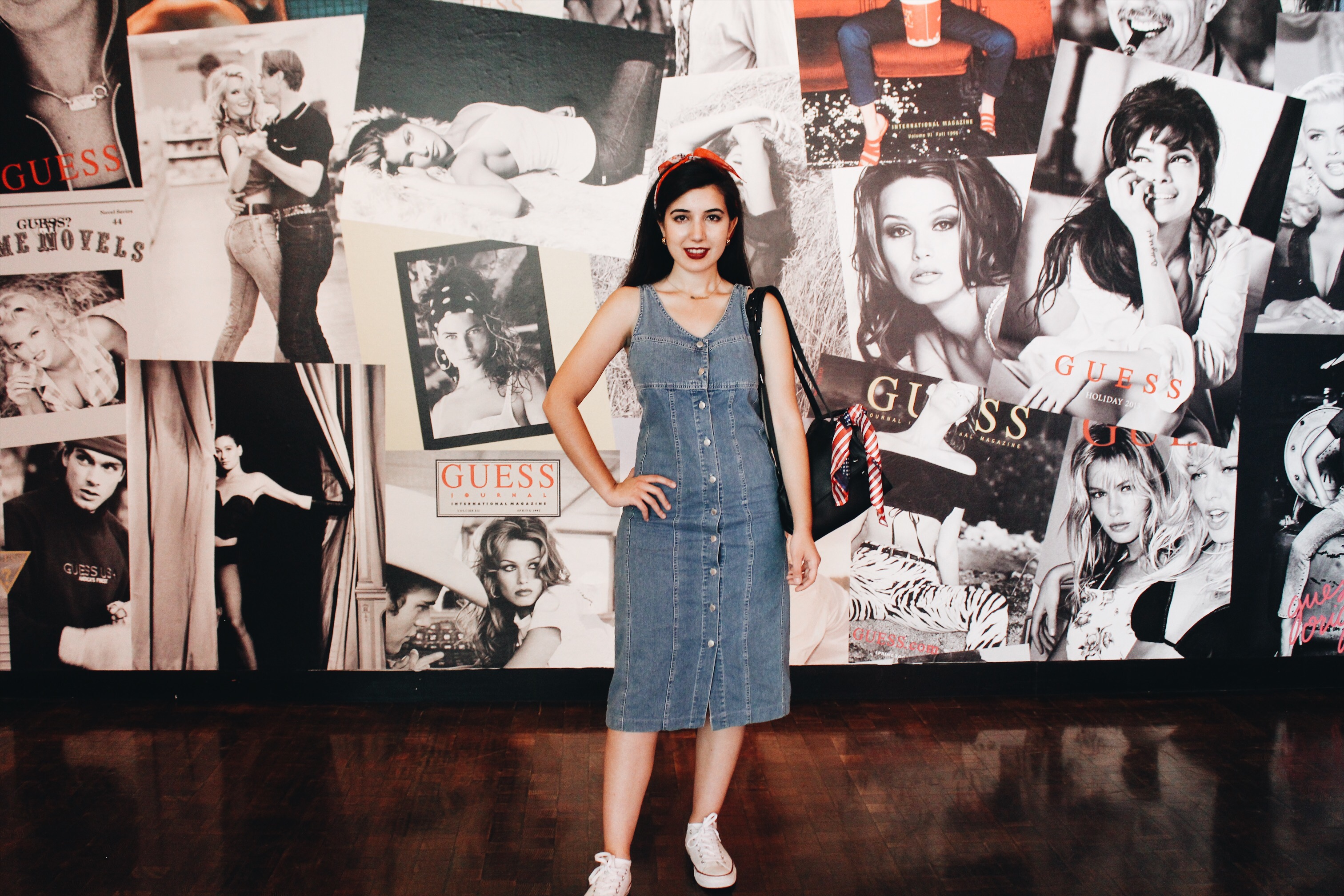I paid tribute to Guess’ denim domination by wearing a fitted button-down jean dress to the retrospective. In the spirit of an Americana in the midst of Americana, I had to sport some red, white, and blue! I wore neck scarf in that color scheme as a headband and my black leather top shop bag wore an American flag neck scarf from the California state capital around its neck. For a long day of walking around Downtown LA a pair of white converse were just the thing, especially since the red and navy lining picked up on the colors of my two scarves. I topped the ensemble off with some gold jewelry, betraying my nation a bit by accessorizing with a necklace including the London skyline!