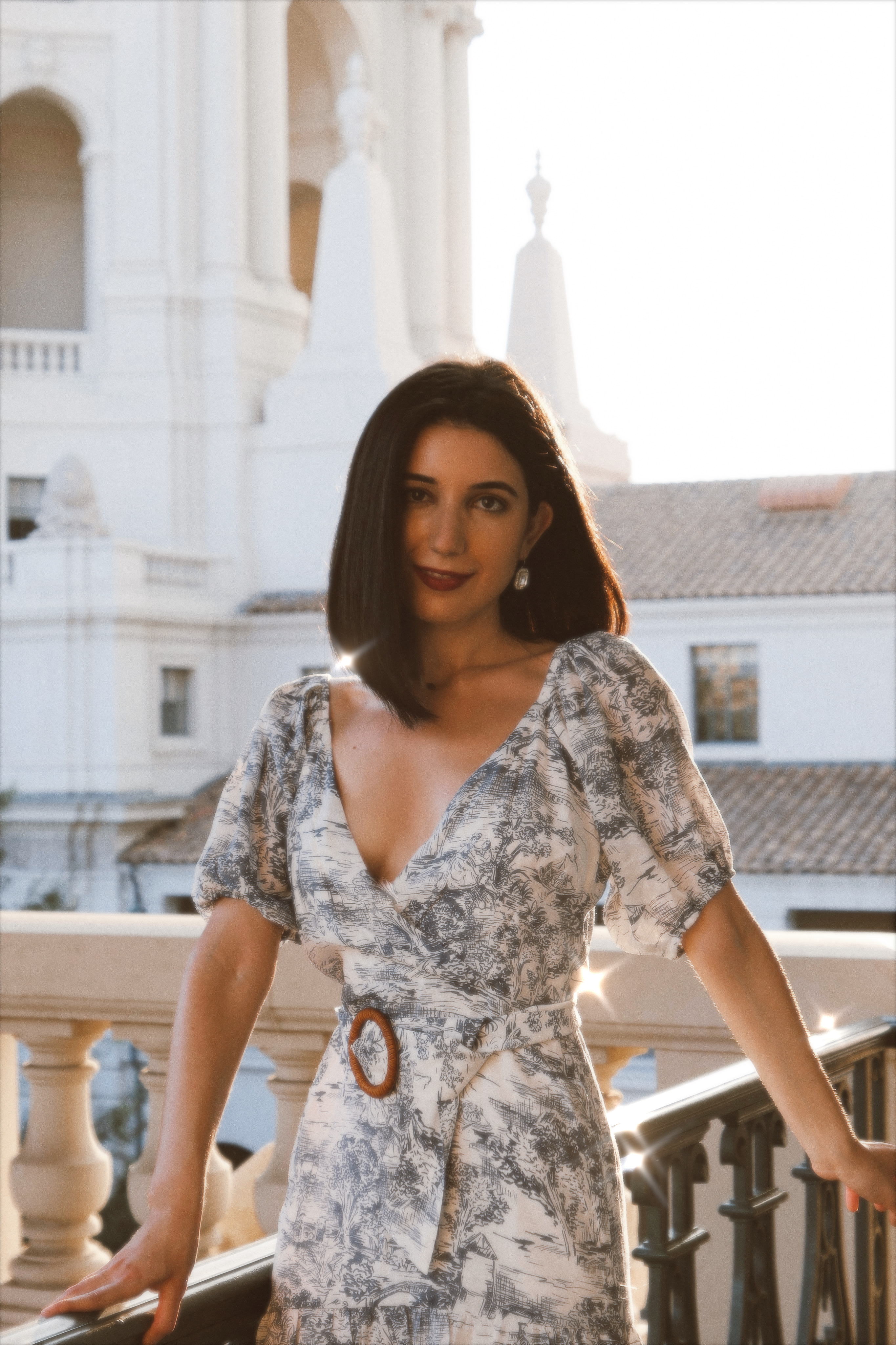 When wearing this dress in the tower of Pasadena City Hall, a haven of historic architecture, I felt completely in my element. Pasadena is one of those few jewels in California where oak trees stencil the sun’s light on your car as you drive on by, an arcadian paradise with large, manicured houses. While I can’t time travel, a two-hour car ride can project such a scene embodied on my toile—peaceful, charming and brimming with possibility. And let me tell you, during a pandemic, it was just the socially-distanced outing with a dear friend that I needed, in just the right dress.