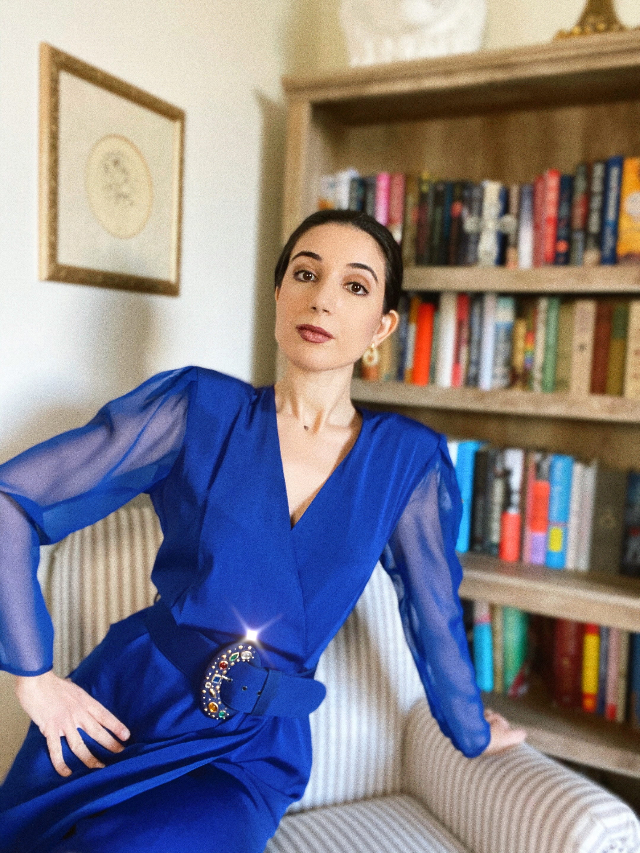 The American Music Awards are fan-voted, and this indigo dress has been a crowd pleaser for my fellow chicsters since I first introduced it on Instagram. It only seemed appropriate to grace the Zoom screen and our viewers’ televisions with this strong-shouldered showstopper! There are so many elements that make this number special, from the sheer sleeves, to the rainbow bejeweled belt, to the shoulder pads and the unique hue. I kept with the vintage theme and opted for these layered gold hoops I consigned from a boutique in downtown Bakersfield. I slicked my hair back to keep the look sharp and keep the attention on my winsome wear. This dress was from another favorite haute haunt of mine—my mother’s closet from the ‘80s and ‘90s. She wore this pinafore when my father asked for her hand in marriage, so I think it’s filled with some serious magic!