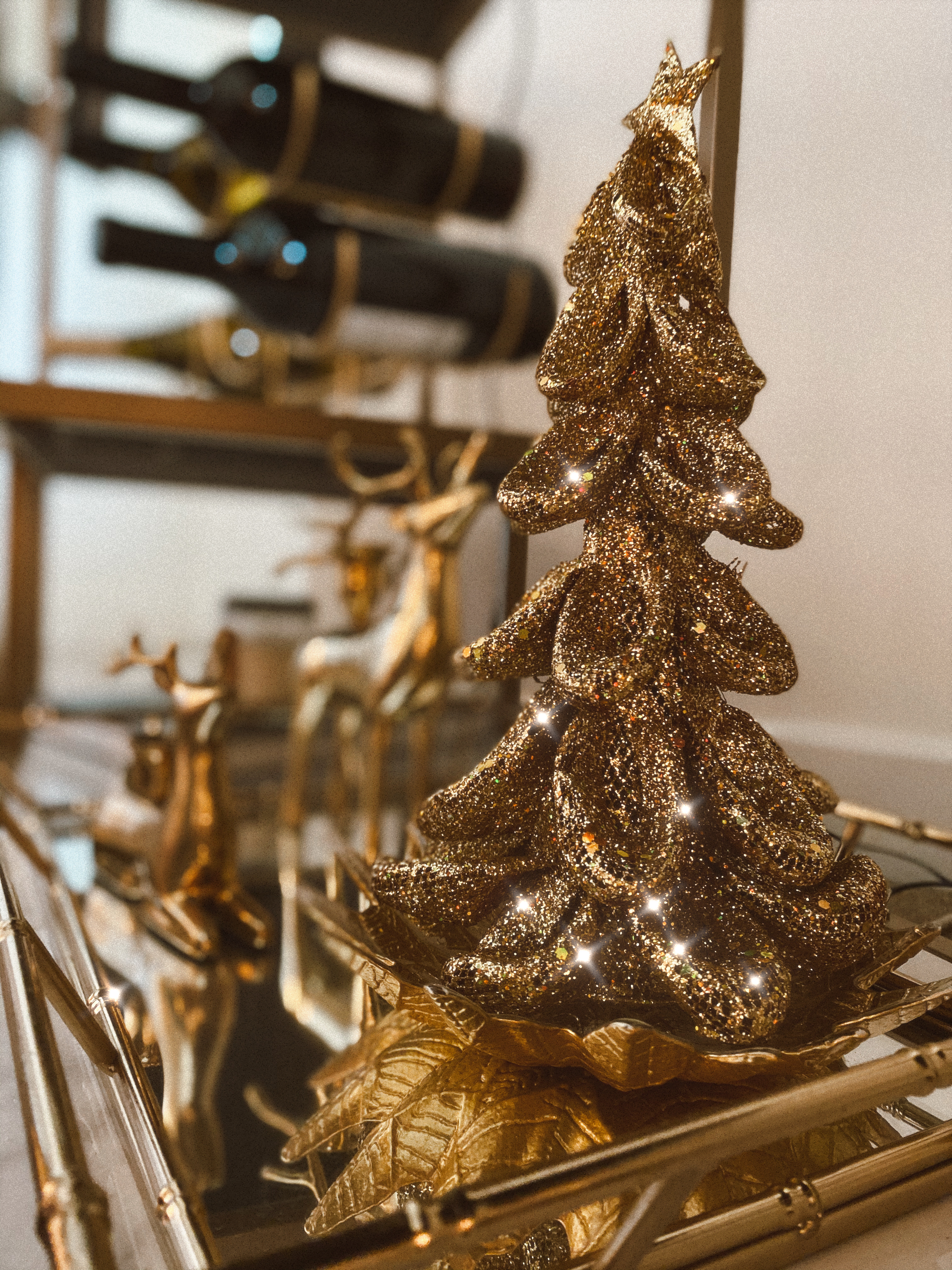 Other than the tree, we ‘decked the halls’ with other elements of the season: golden reindeer on a gilded, looking glass tray on my marble TV stand. On the coffee table, my mother filled a golden-rimmed marble cake tray with leftover ornaments. My bedroom received the holiday treatment as well, with a nutcracker (another ode to our favorite holiday tradition) a red Christmas blanket, and two festive pillows. Suffice to say, Christmas in the Krischic crib is in full swing!
