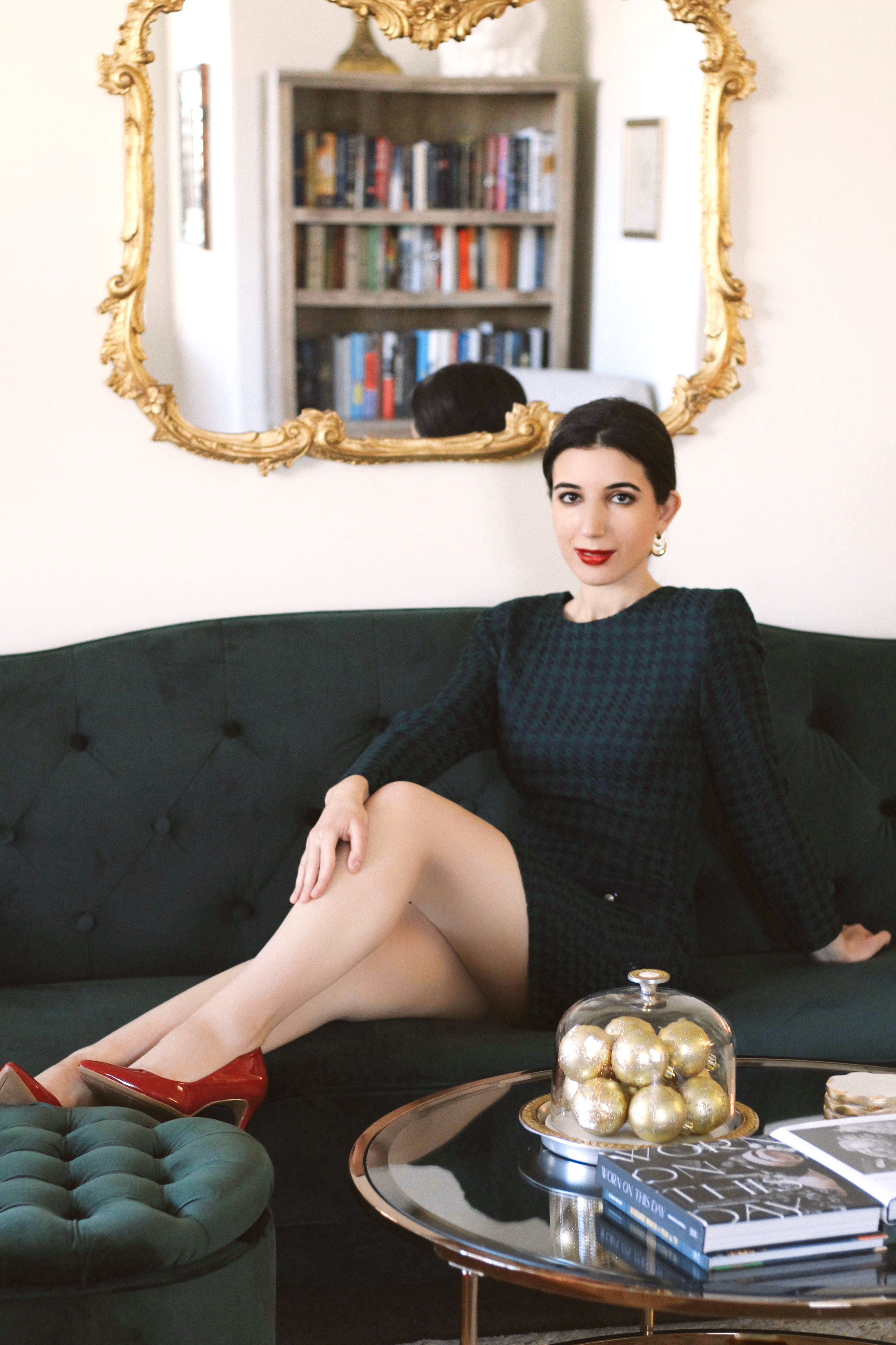Of course, I had to match a dress to the merry garnishes around me. This green and navy houndstooth number basically looks like Christmas wrapping paper, which is felicitous when this ‘80s dress was given to me by its previous owner, my mother (shocker). The shoulder pads and fake pockets with gold buttons, are fun finishes like a bow on a present. I chose this green to match the shade of my emerald sofa, which unintentionally made the space feel even more fitting for this season. Final festive frills include red pumps and lipstick for vintage gold hoop earrings to pick up on the buttons.