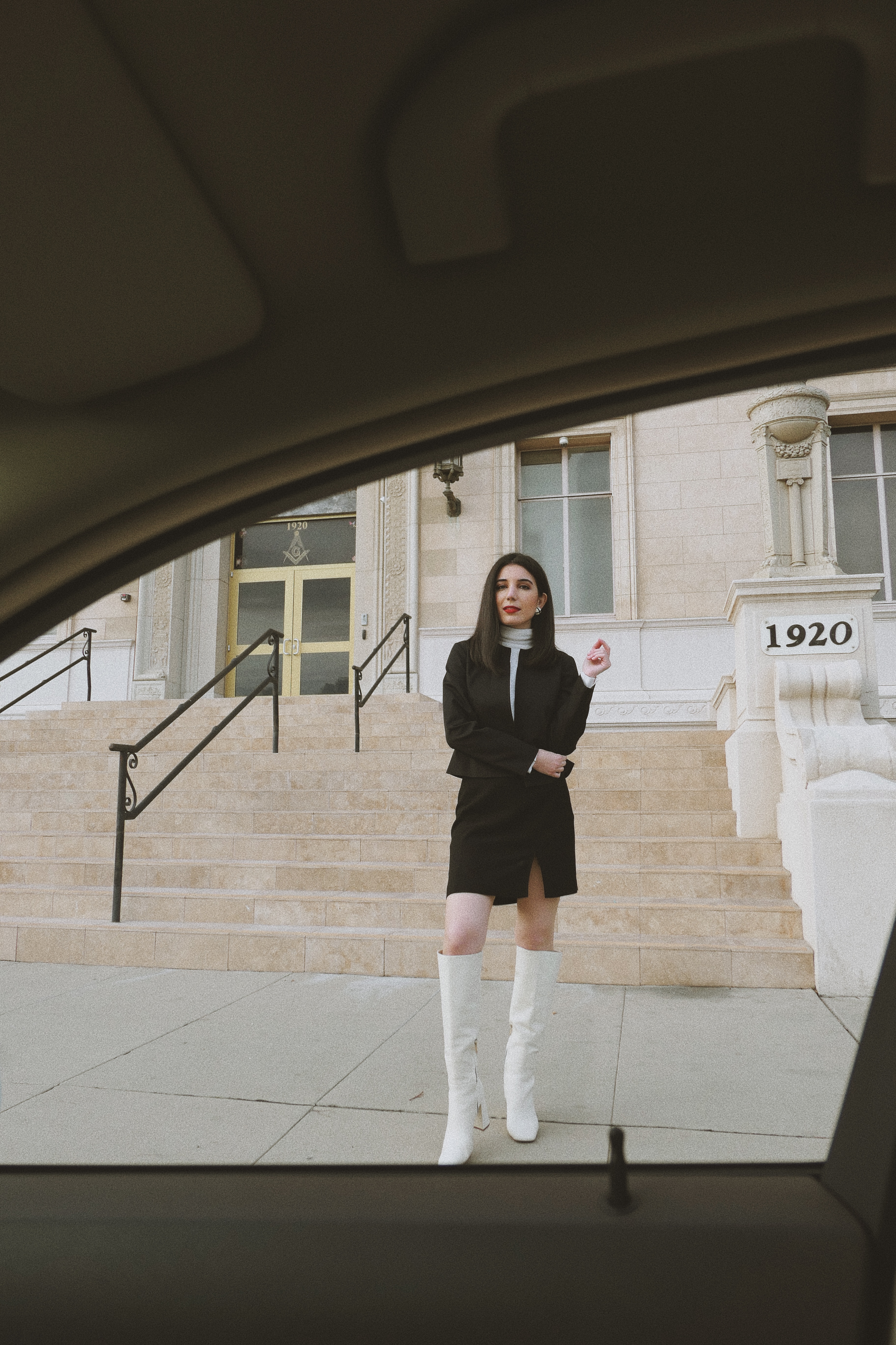 When combining the hues of yin and yang, there’s a power in the aesthetic of contrast. It can really make you pop when you’re on-air, despite the colors being muted. This black jacket, save the usual blazer collar has a crisp and blunt cut that further emphasizes the off-white turtleneck beneath. The top acts like the cream of an Oreo when sandwiched together with this black mini skirt with a subtle slit. I switched in this skirt with the mid-length one initially paired with the outerwear for a more unconventional work suit that can be worn with go-go boots. I like the way the boots give this look a mod feel (another ode to mod fashion on-camera in this post). This ensemble, to be sure, will give a traditional black-and-white suit (which I also love) a run for its money. As we approach warmer months, you can easily switch the turtleneck out for a ribbed white T-shirt and a three-quarter-sleeve blazer for the same effect.