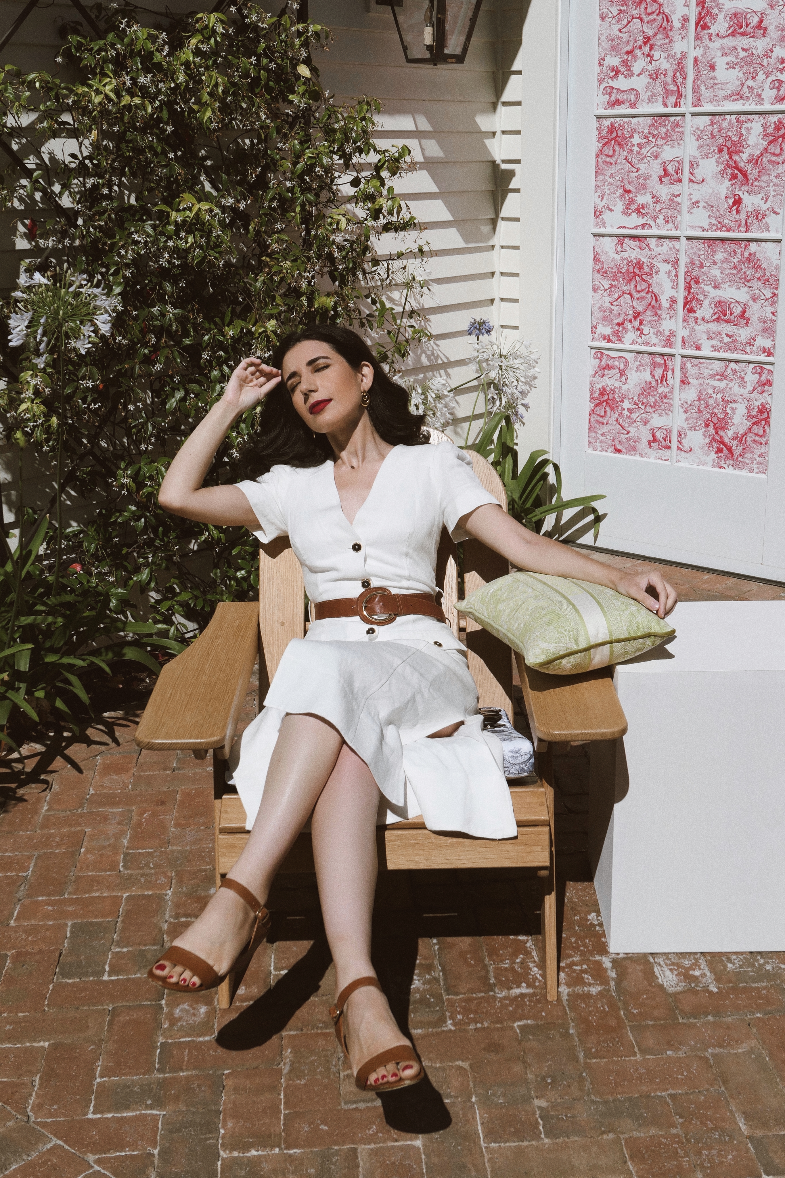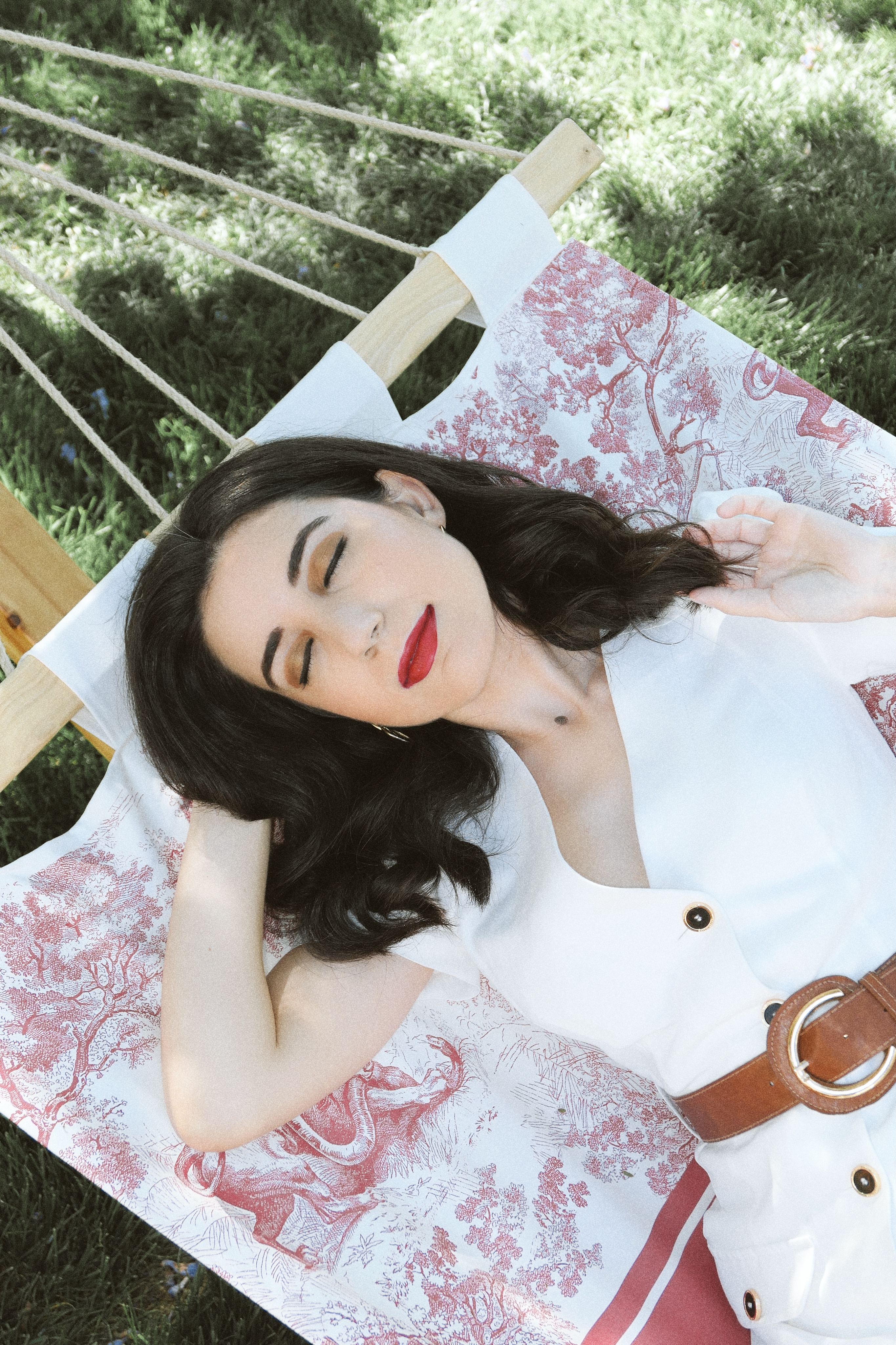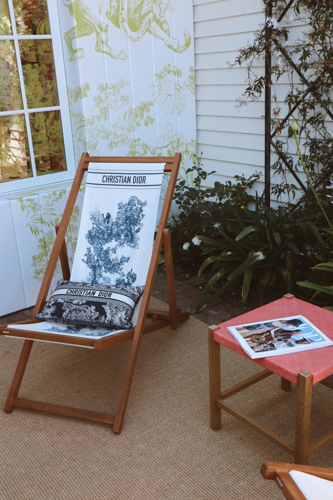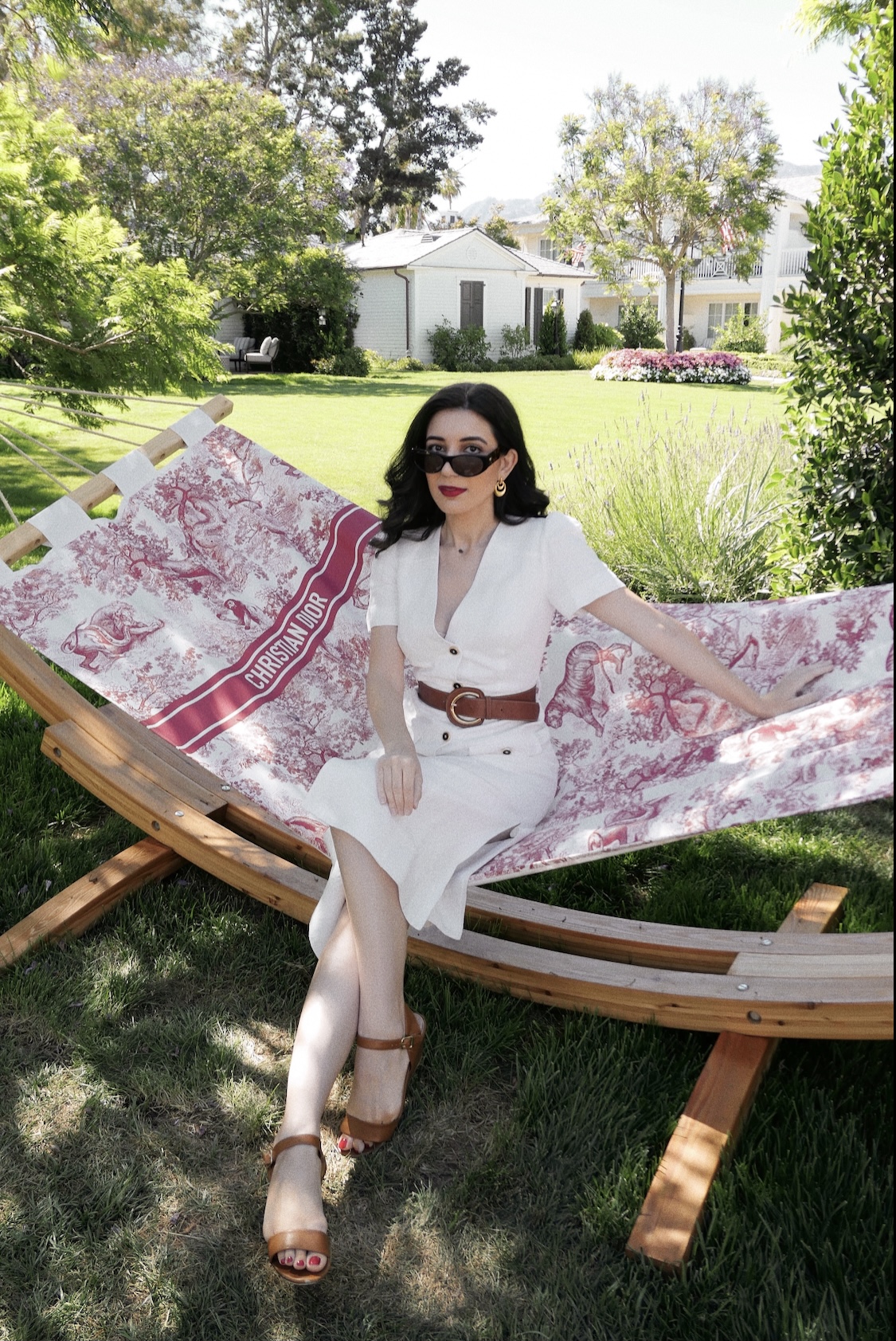 I dawned a crisp-white dress with golden-rimmed tortoise-shell buttons, cinched at the waist with a buttery brown leather belt, with strapped sandals to match. I finished the look with a red lip, lush curls that danced in the ocean breeze and my grandmother’s Louis Vuitton bag, with an Italian silk scarf tied on the handle. In this outfit, I truly felt like a movie star, and Mari and I arriving to this Dior pop-up was a key plot point to our day. We enjoyed perusing the ready-to-wear Dior collection, curated in the form of an art exhibition and taking photos on the Dior hammock surrounded by spring blooms. Online shopping has changed the brick and mortar experience in that way: Since it’s more convenient to window shop online and build a weightless cart, the in-person shopping experience has to offer something extra: it has to well-curated and become an experience for the shopper. After a year of barely doing anything in person, a luxury pop-up like this one was a breath of fresh coastal air.