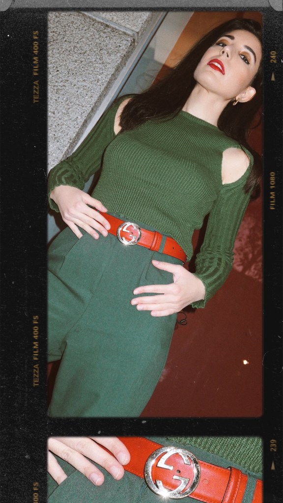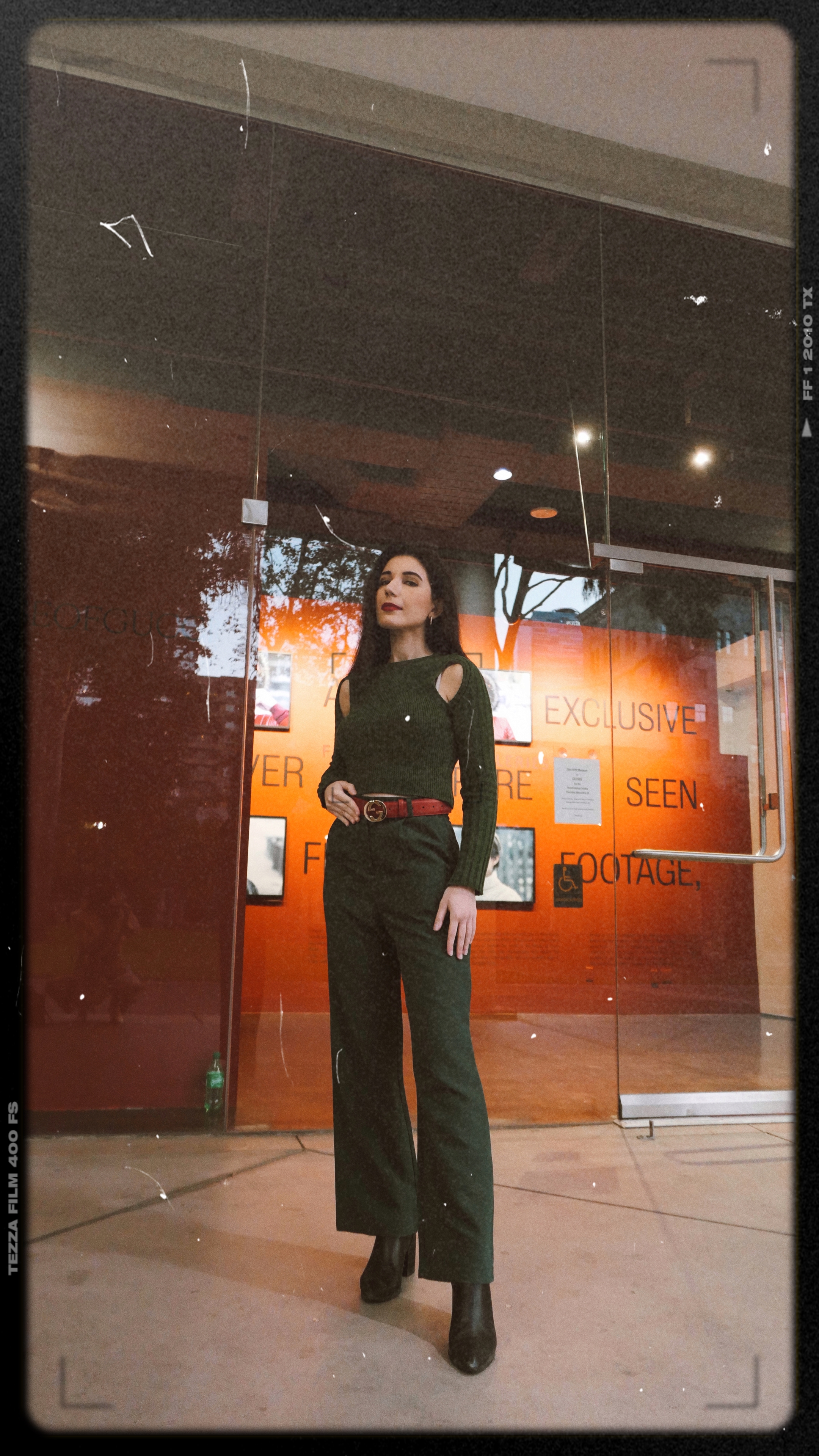 The creative choice evoked a photographer’s red room, and along the walls above the mannequins in their Gucci finery, were stills of Lady Gaga, Adam Driver, and Jared Leto from the movie. The red walls picked up on my rouge Gucci belt, calling like to like. The accessory on my person was the centerpiece to a wildwood of forest-green fabric. This cutout sweater and tailored trouser combination screamed professional with edge, while remaining nonchalantly comfortable for walking around all of LA for all things Gucci, including the exhibition (which you can catch until December 4). Seeing these looks translate on screen, with all the other production elements in place, this was clear: