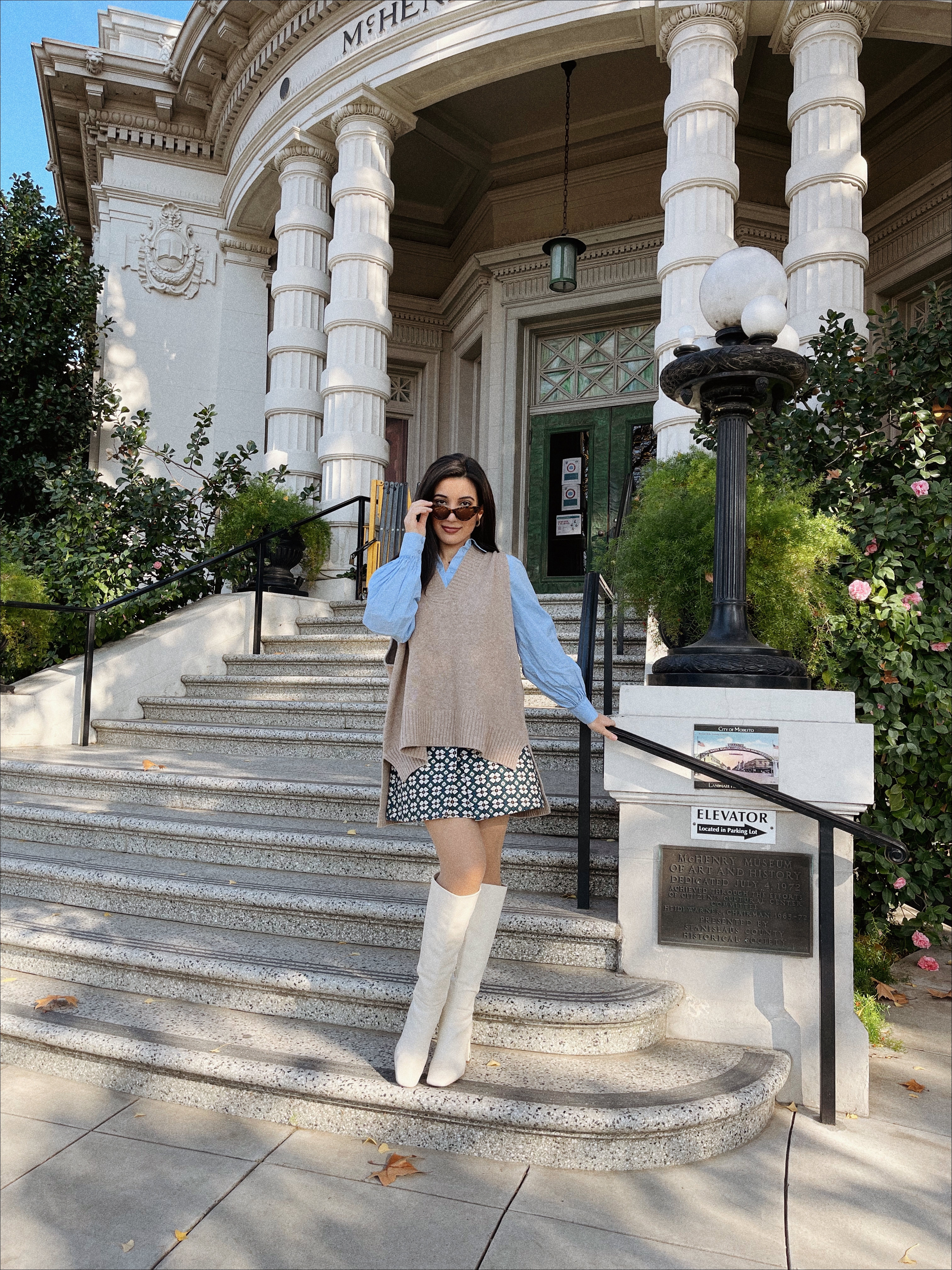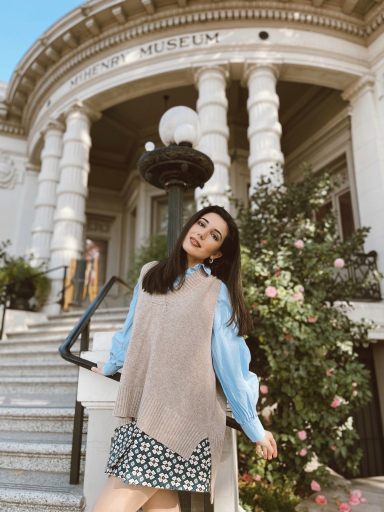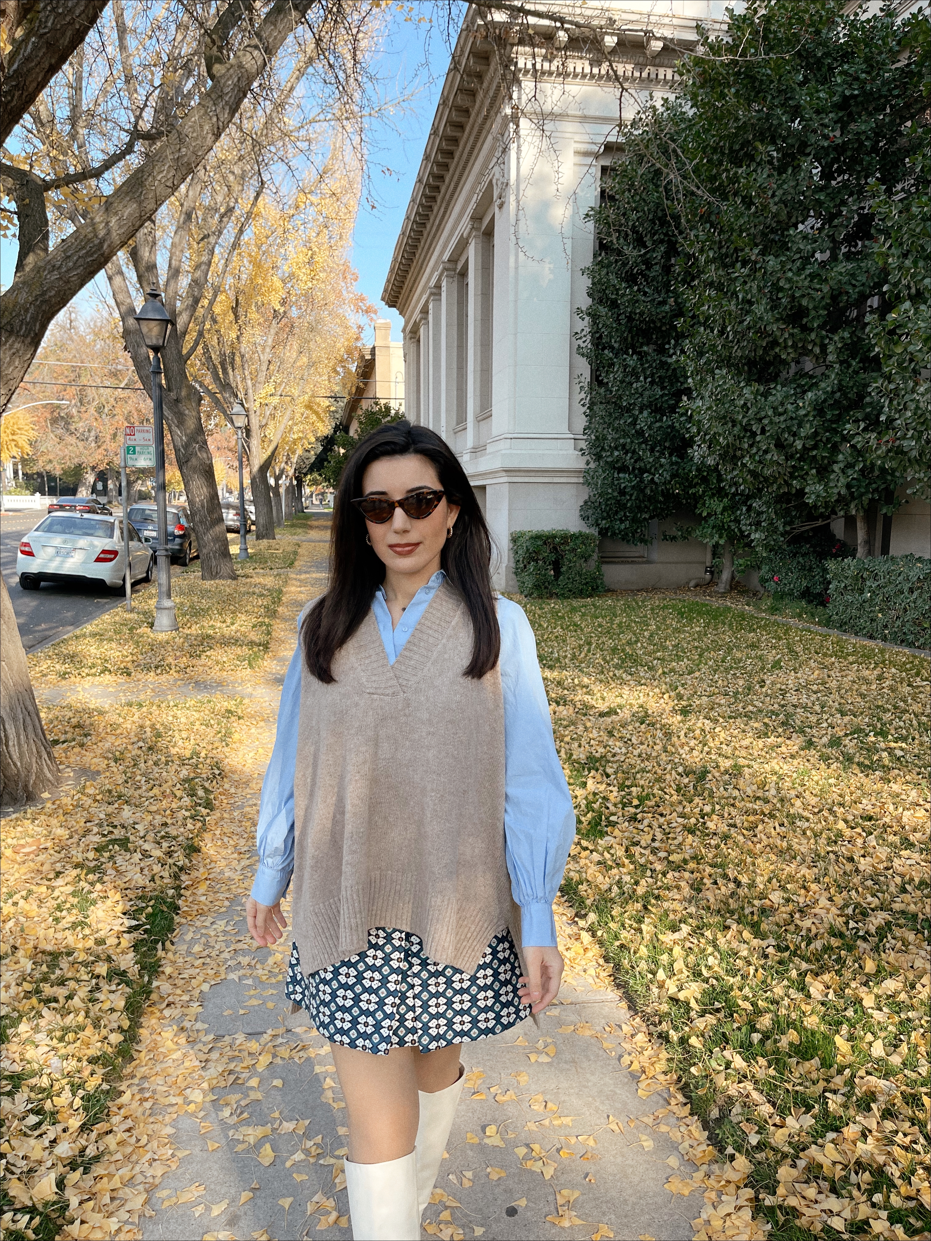 Besides my ensemble a la my alma mater’s merch previously mentioned, here is another take on the reemerging trend that is part ‘60s mod, part Cher from clueless (by the way, has anyone seen. Alicia Silverstone in the Babysitter’s Club Reboot? Such a feel-good show!), and a Blair Waldorf circa Constance fashion throwback! The mastery of this look is all about balancing textures and volume. The oversized camel-colored sweater is the star of this style show, (one of the most on-trend fashion staples in the prepster genre right now), but its supporting actors aren’t shining any less. I opted for a geometrical blue, orange, and white skirt under that picks up on the autumnal hue of the sweater but also meshed with the baby blue button down top. The voluminous sleeves would be overpowering, if not for the stasis the mini-skirt creates in the outfit. Since I’m showing some leg here and it’s cold, skin-colored nylons and knee-high white go-go boots were the way to go. The white calls back to the shapes in the skirt and brings it all together.