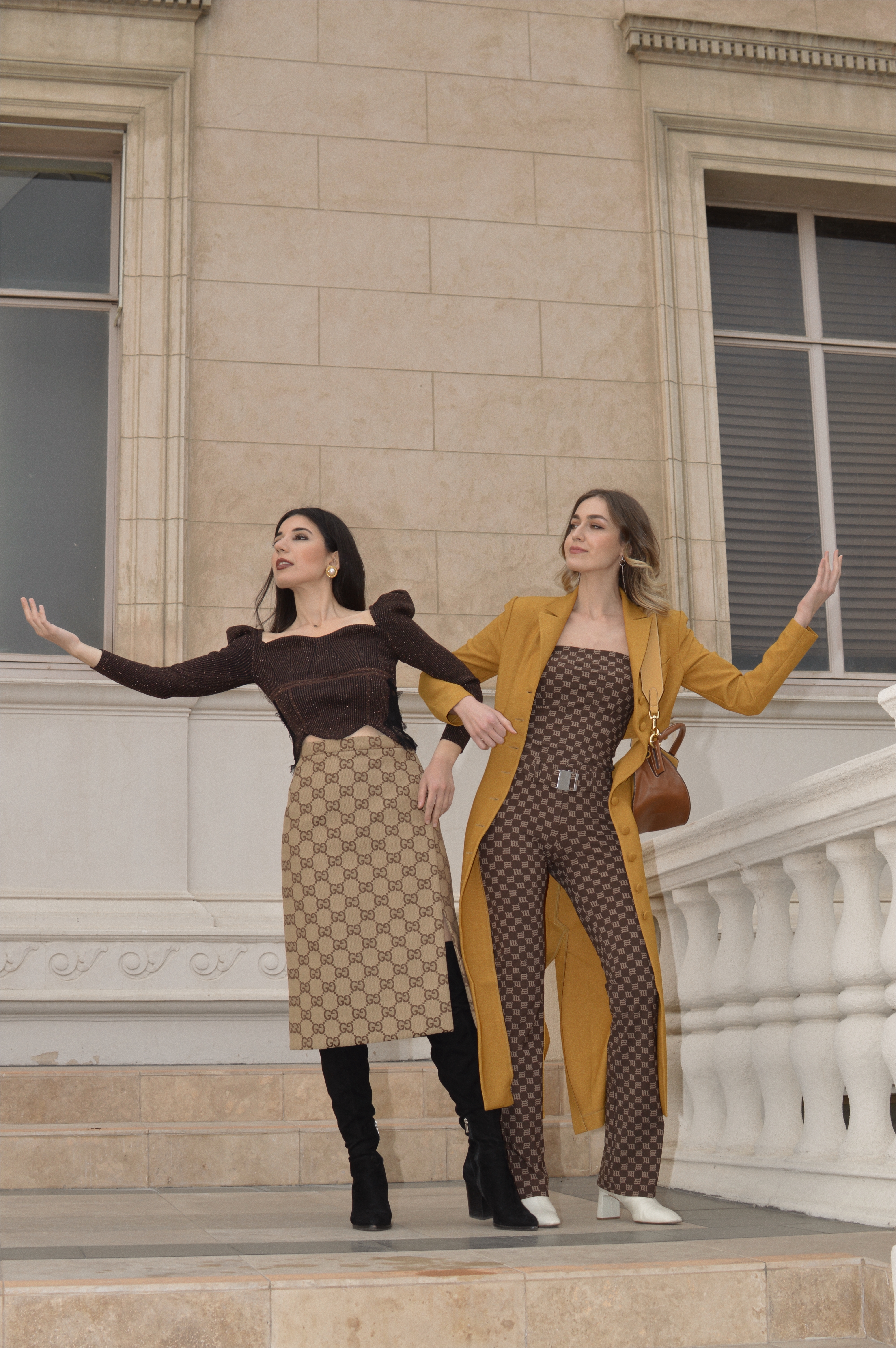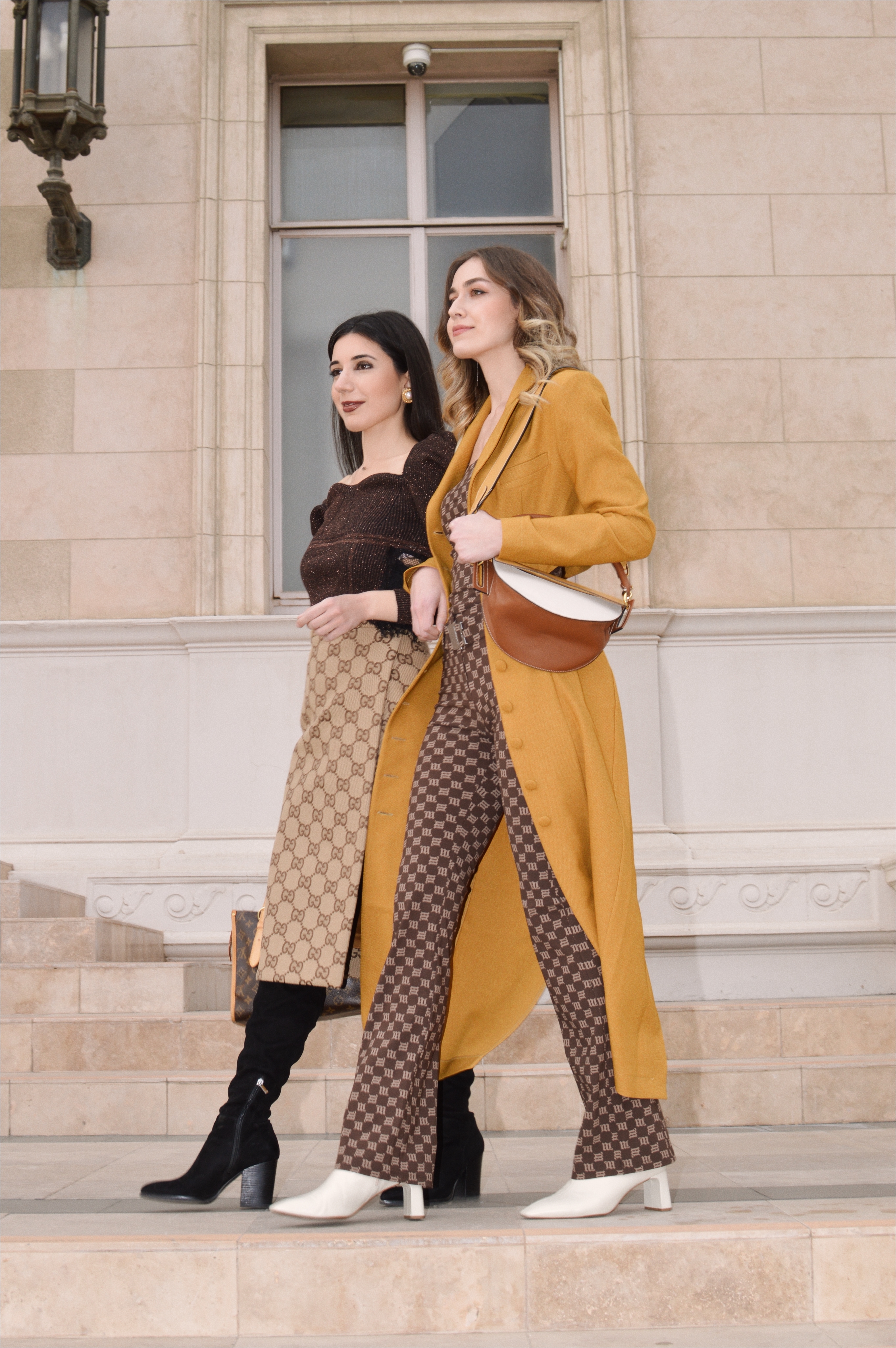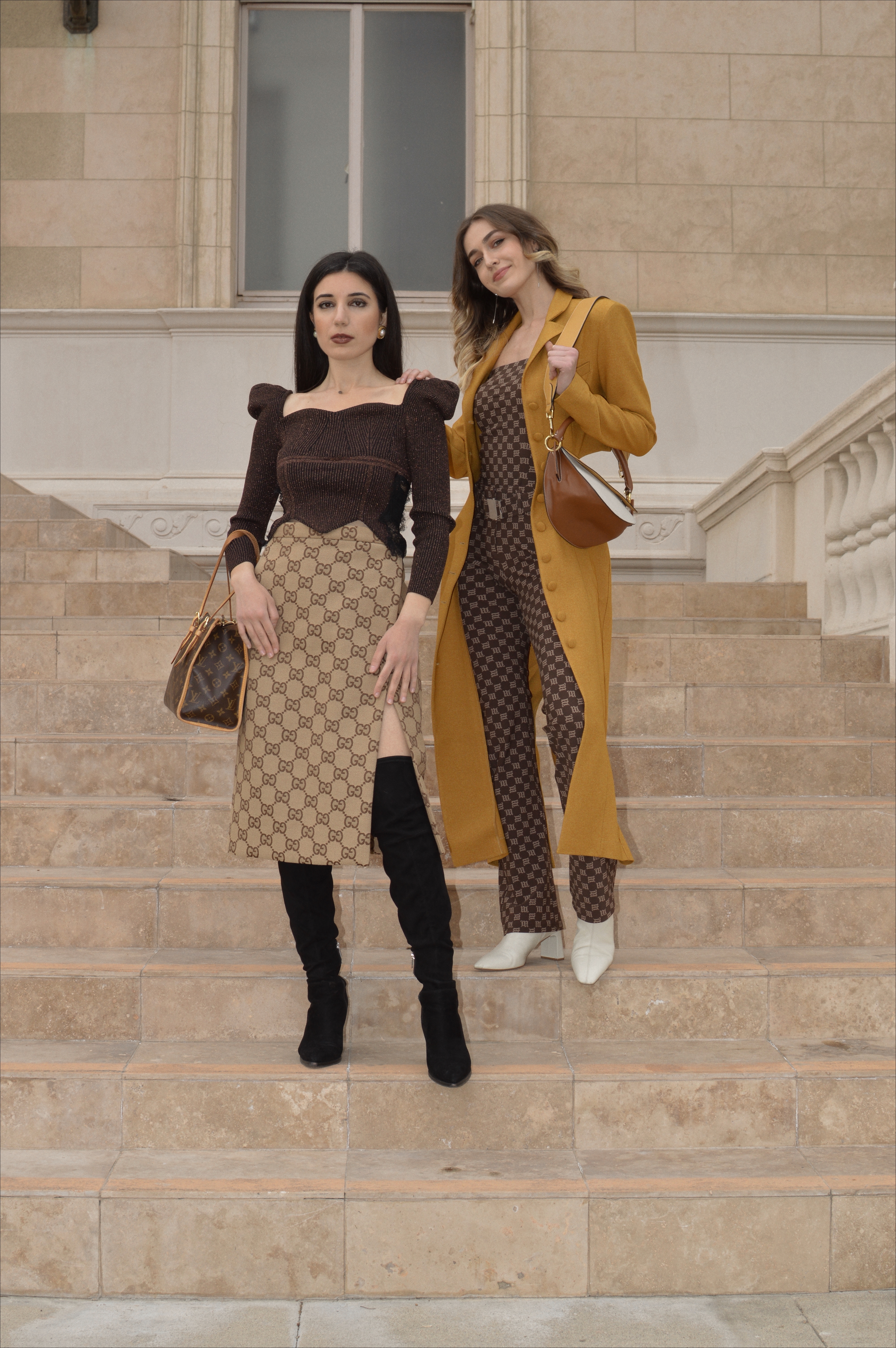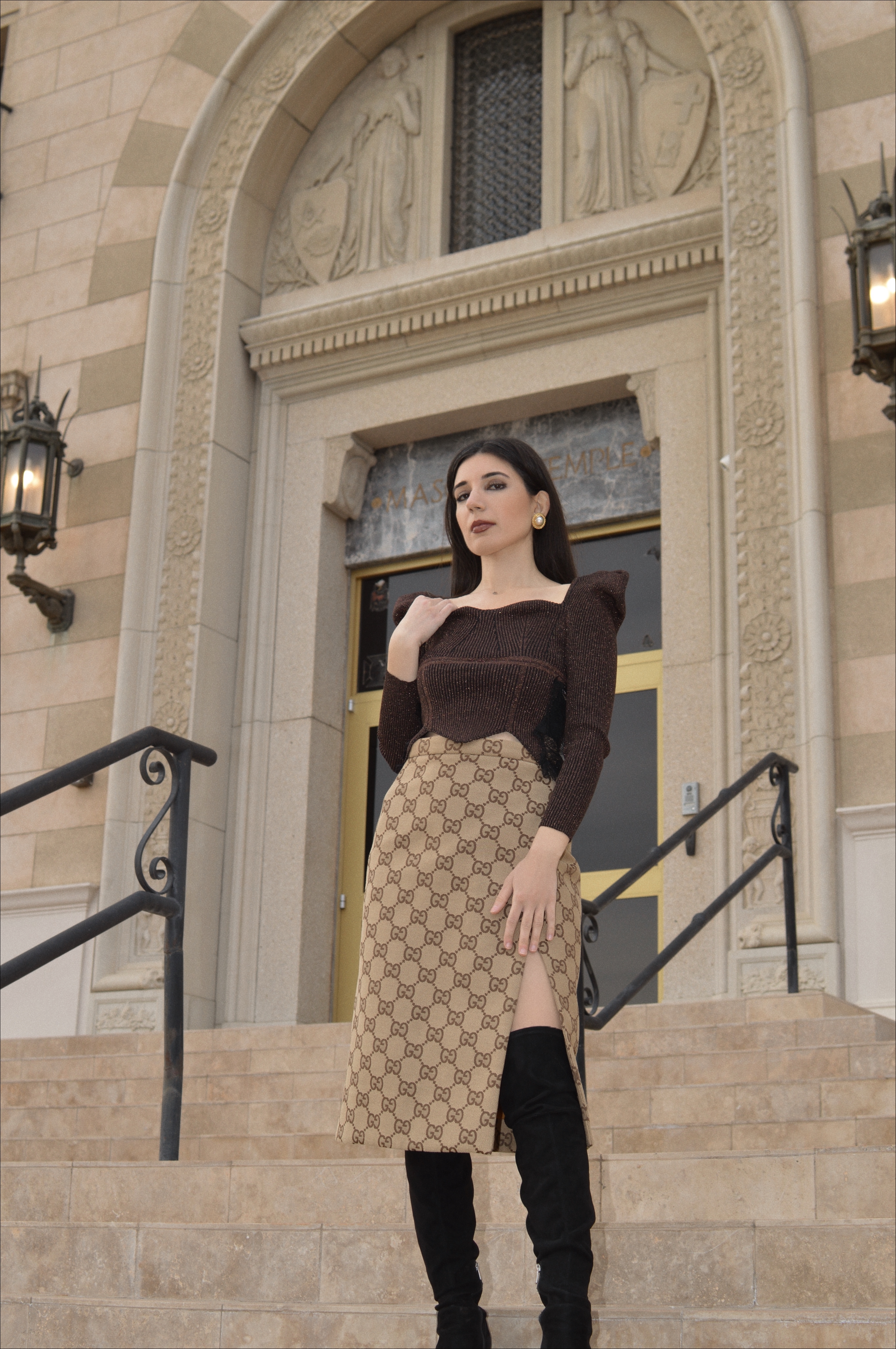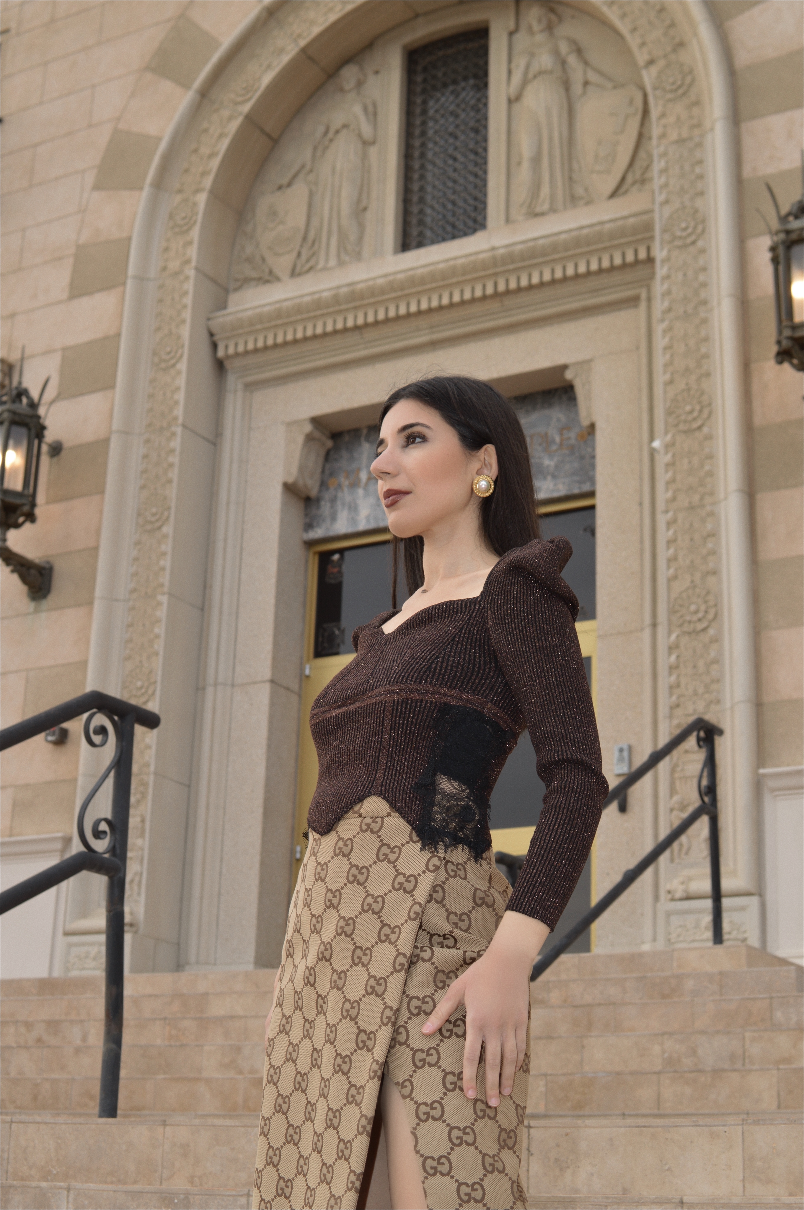 It was a special occasion, and I was prepared to get her all dressed up for it: Playing off the chocolate hues of the “G’s on the print, I opted for a chocolately sweater from Elliat. The ribbed crop came with all the trimmings: see-through black lace on the sides, puffy sleeves reminiscent of the medieval period, and a sweetheart neckline. The slit of the skirt was begging for an over-the-knee boot pairing, and the gold-rimmed pearl earrings were the classic adornment for lady-like deportment.