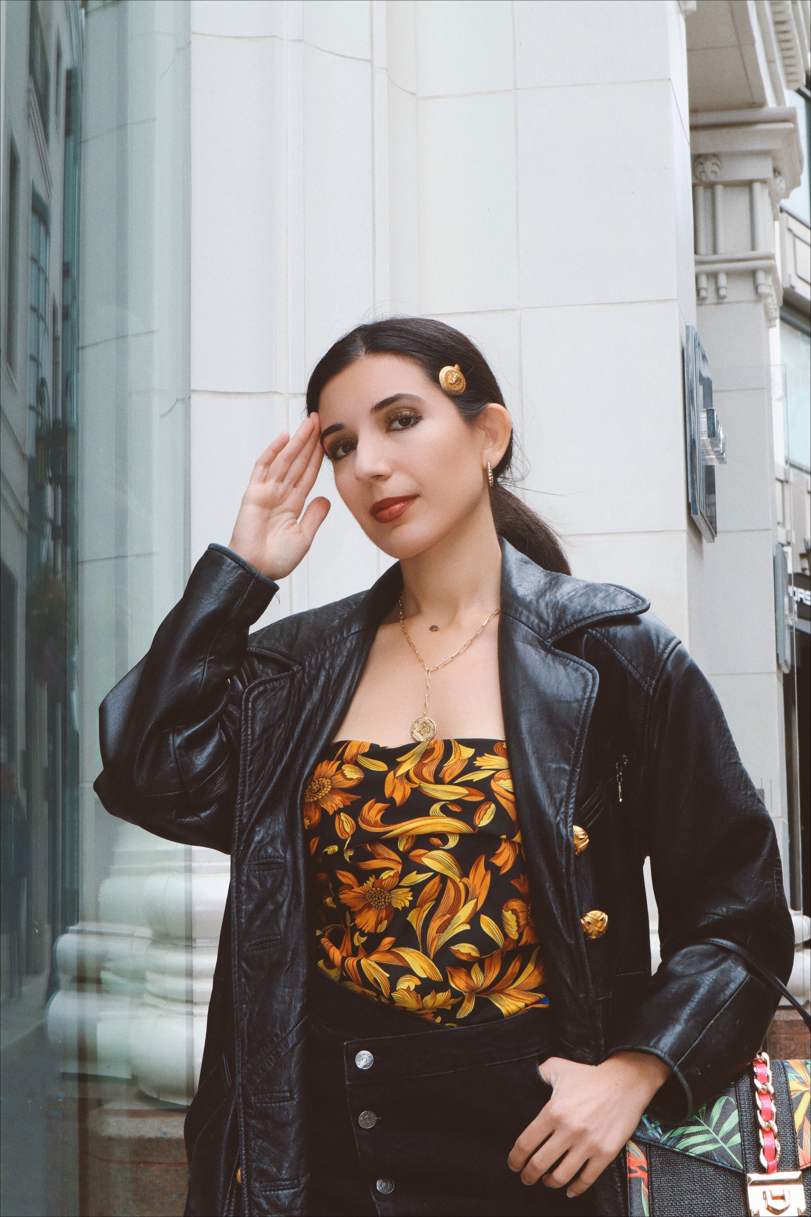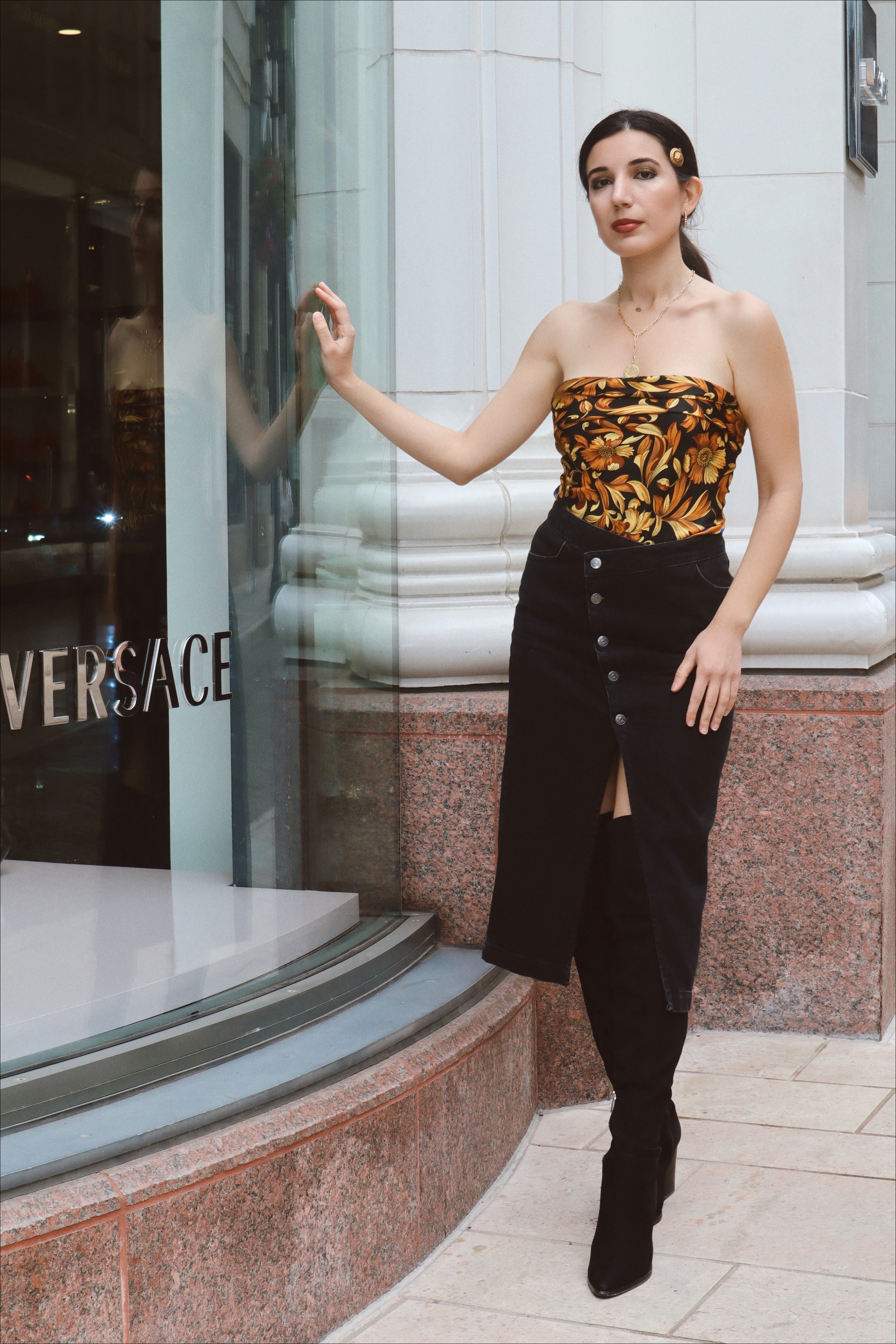 Who needs floral print when you have fleur de lis printed like growing golden vines across a printed scarf–and the iconic medusa head blooming on your head like a floral bud? Thanks to the early 2000s, wearing scarves as tops is back en vogue–even though I’ve been increasing my closet with this neat trick–since early 2019. I tucked in this black, gold and blue one that was my mom’s in the nineties–into a charcoal denim asymmetric skirt. The slit on this piece allows for an iconic shoe moment: my over-the-knee black suede boots. I slicked my hair back into a low pony, and played off the gold Versace pin in my hair with a medallion chain necklace from Gorjana. And since Versace is the literal embodiment of Italian maximalism, I opted for a multi-colored Island print canvas bag. This one ties everything together, with its gold buckle and onyx canvas backdrop.