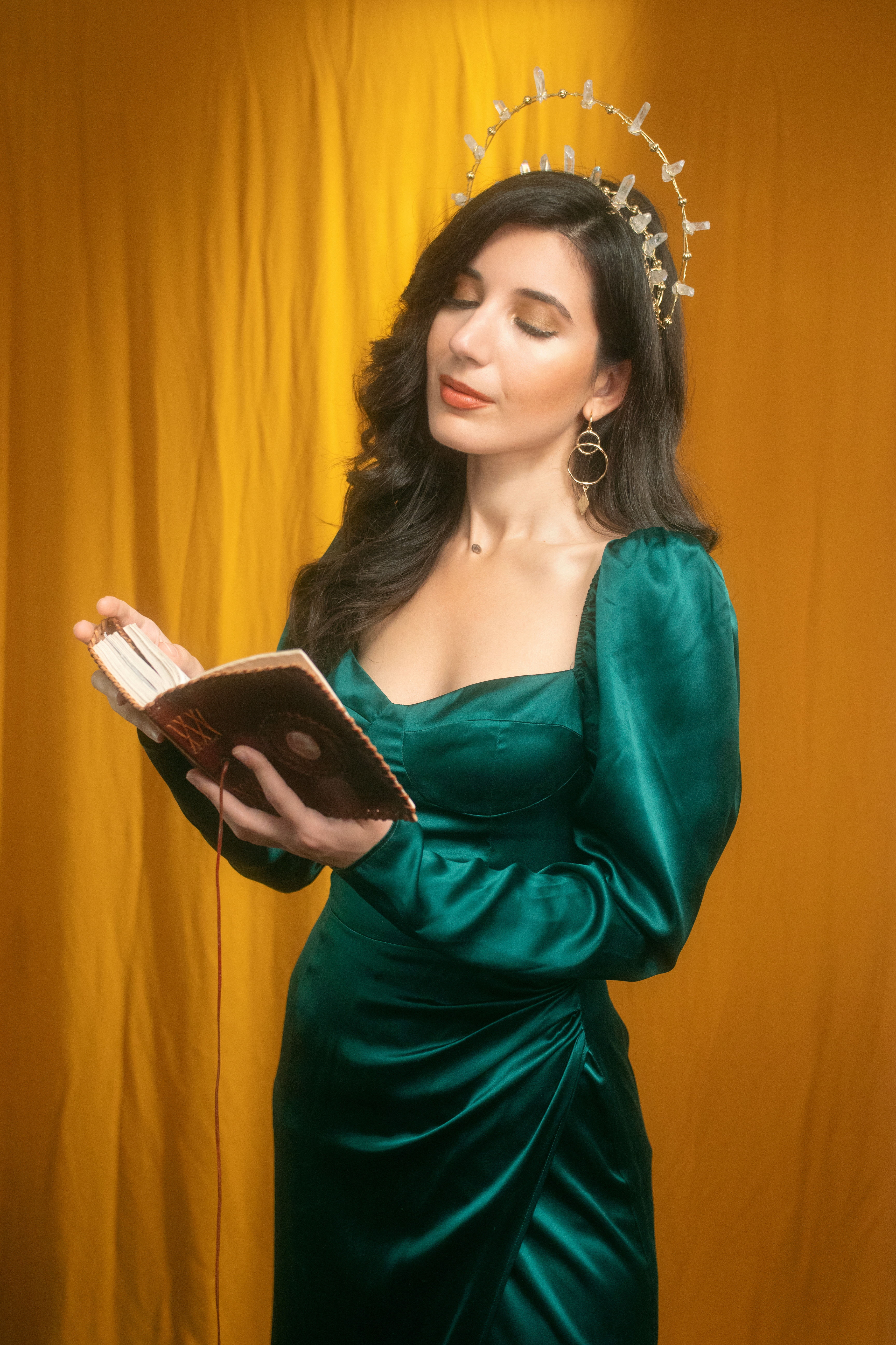 The Empress of Hades is similarly clothed in a satin Emerald gown with puffy sleeves and no waist, while mine does cinch into a more Renaissance-evoking bustier. Her hair spills in raven coils as mine in these photos, but rather than clutching a Pomegranate in regret for ruling the underworld alongside Jupiter (Hades), I decided to emerge triumphant over evil temptation in a halo crown. Keaton made this completely by hand with wire and crystal beads. The inspiration came from the “Heavenly Bodies” theme of the Met Gala.