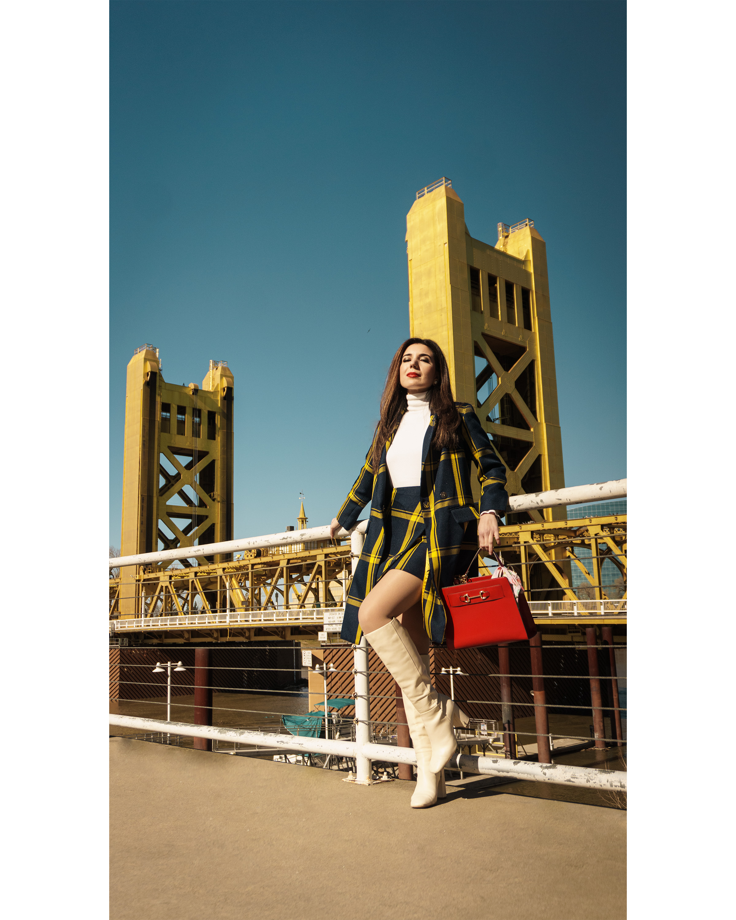 Upon first glance, you may think Etro’s Fall 2023 Ready-to-Wear show at Milan Fashion Week influenced my decision to sport a plaid skirt suit. Or perhaps Burberry’s Fall 2023 Ready-to-Wear runway at London Fashion week. But this animus came from the California capital city’s architecture. Sacramento is eclectically outfitted in Victorian houses and modern skyscrapers. It’s a city veined with trees and beating with culture. And apparently, it’s also Midas touched, as evidenced through the gilded Tower Bridge.