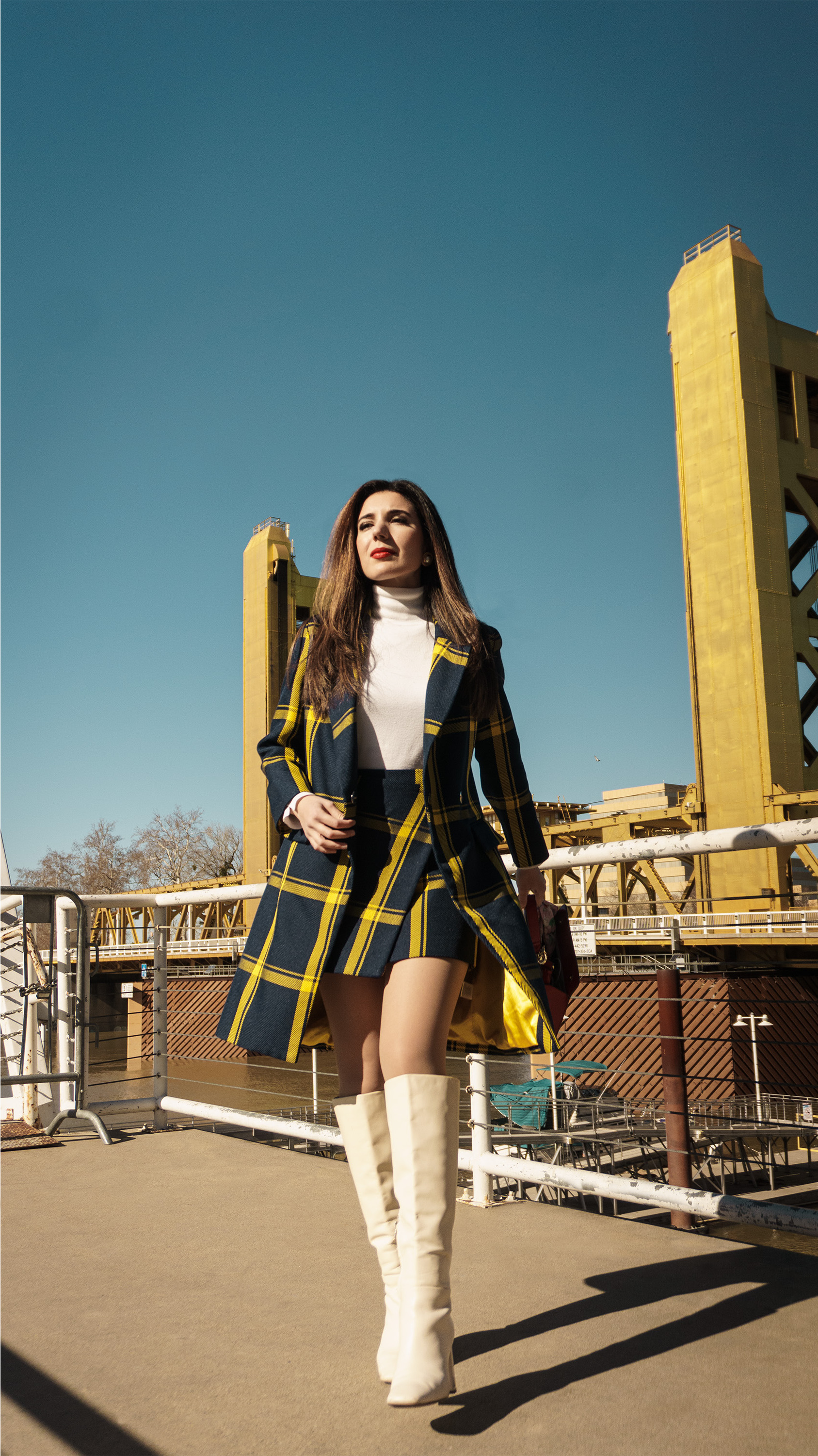 My trench coat and skirt were the colors of the sky that day and the golden rails of the bridge. If the bridge is called tower, I wanted my outfit, complete with a cherry red handbag and a matching lip, to rise above its height (That’s completely possible in these knee-high go-go boots). It’s the overachiever in me, that hums slightly quiet, unless pressed. It’s a mentality I’ve had from one Tower Bridge across the pond, to the one here in the Northern West Coast of California.