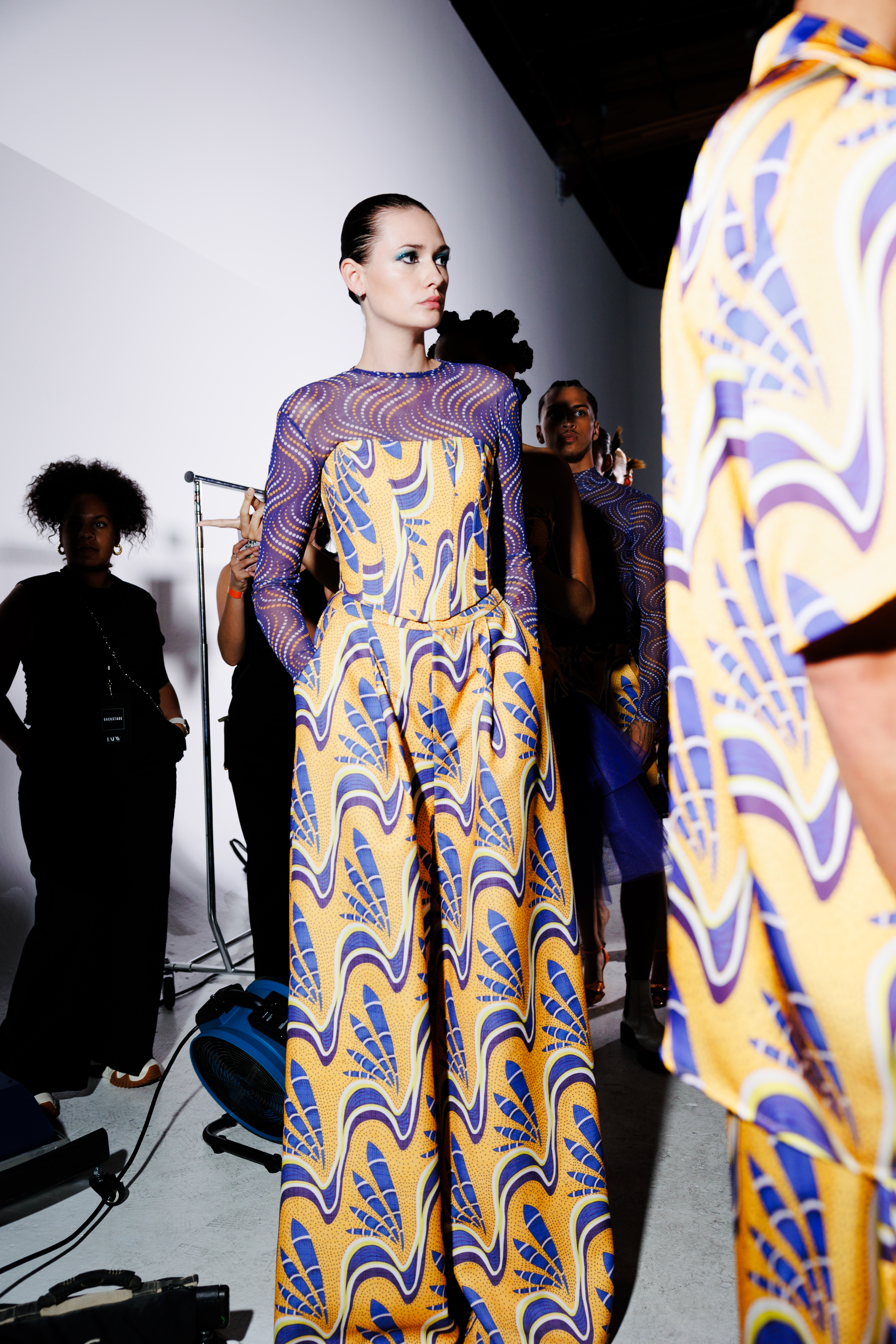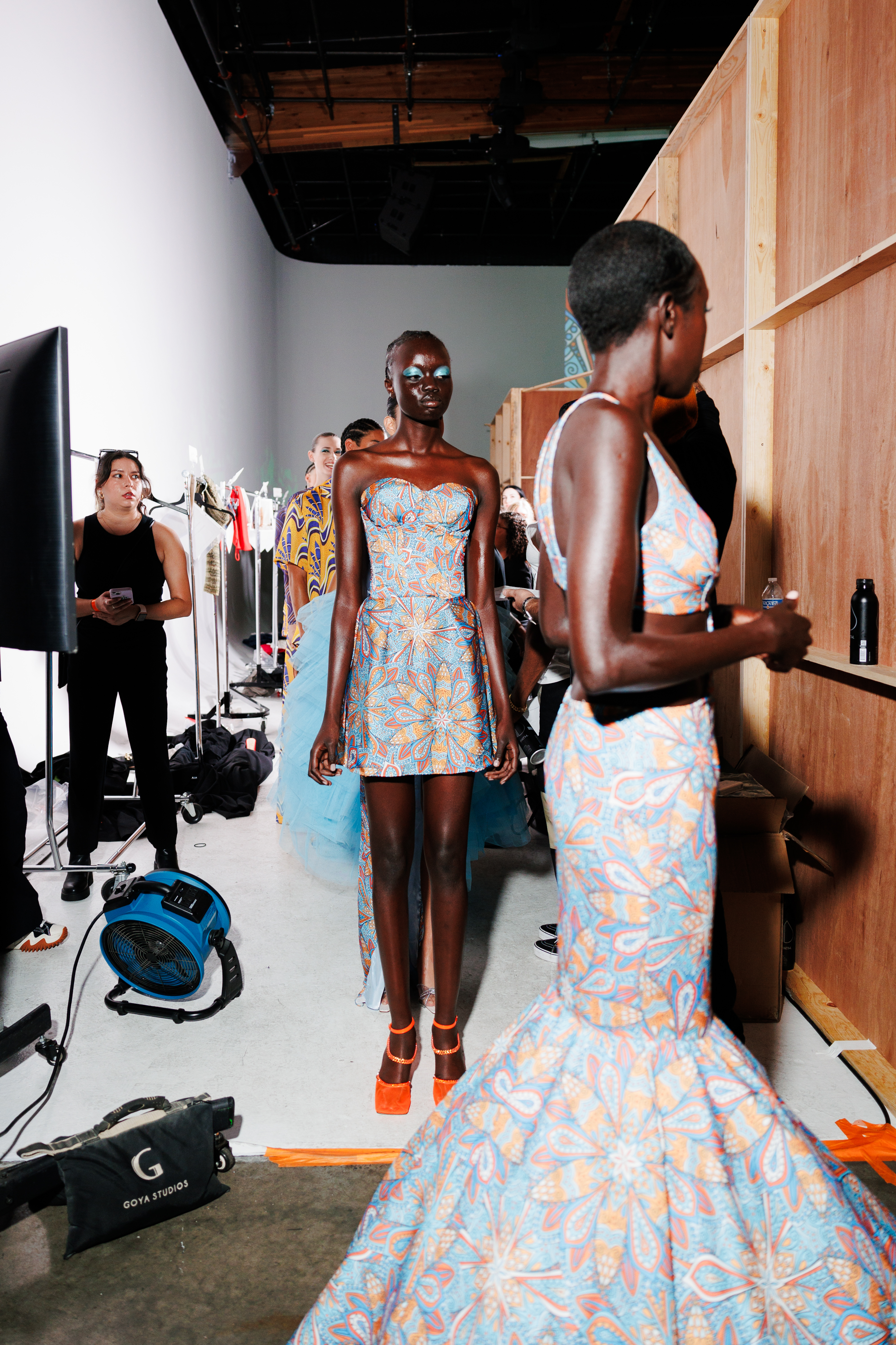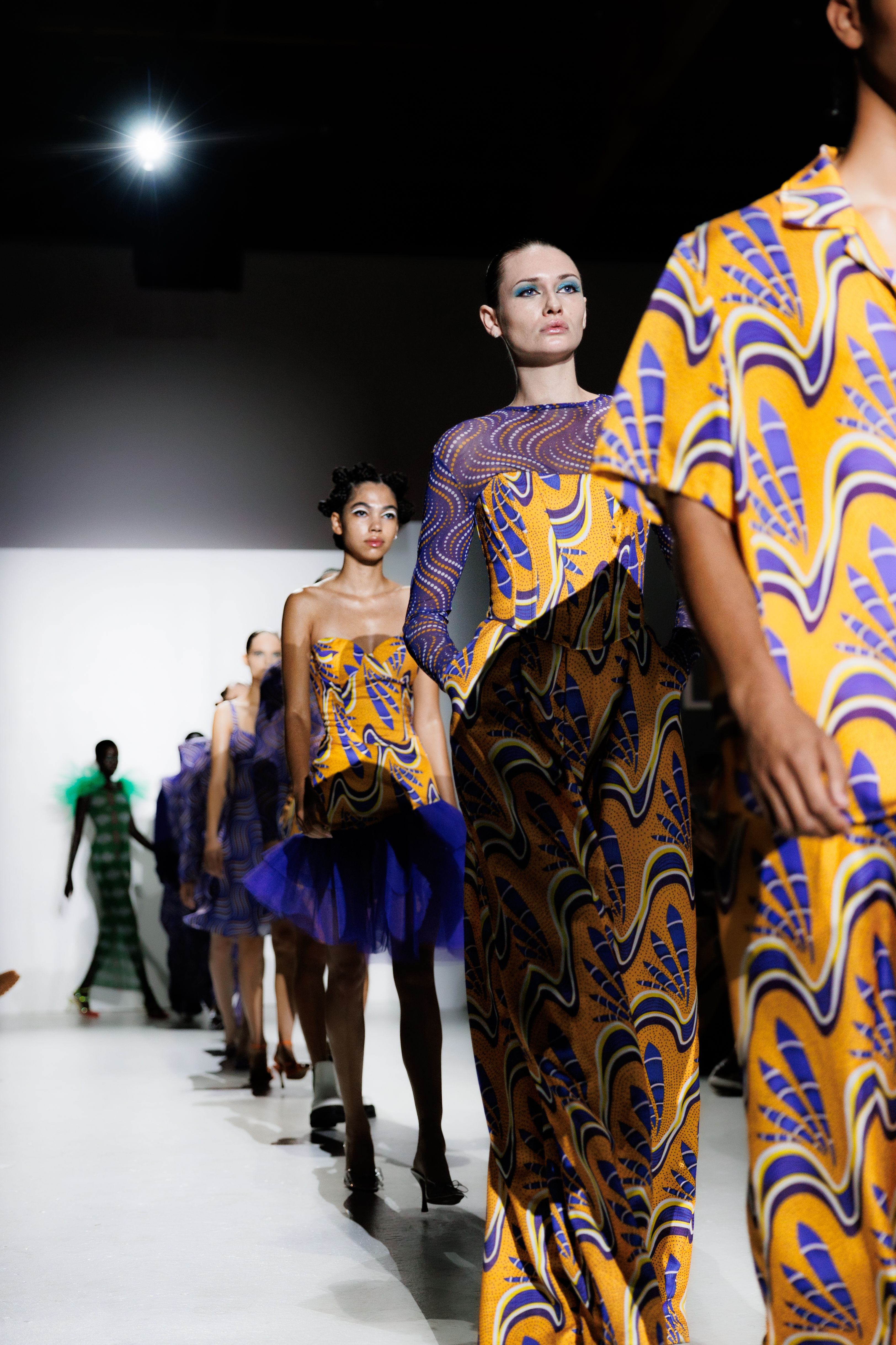 Eyes followed a maxi dress of green and pink, shoulders crowned with tulle. More tulle spilled down in layers and layers of a drop-waist gown, an echo of the kaleidoscope along the venue’s walls. Those eye-catching prints are inspired by Kameni’s Cameroon Heritage. The designer was raised there before moving to the United States at eight years old.