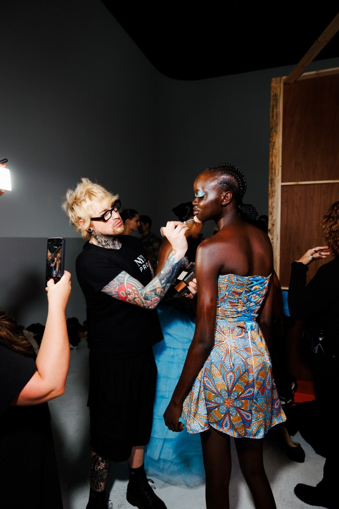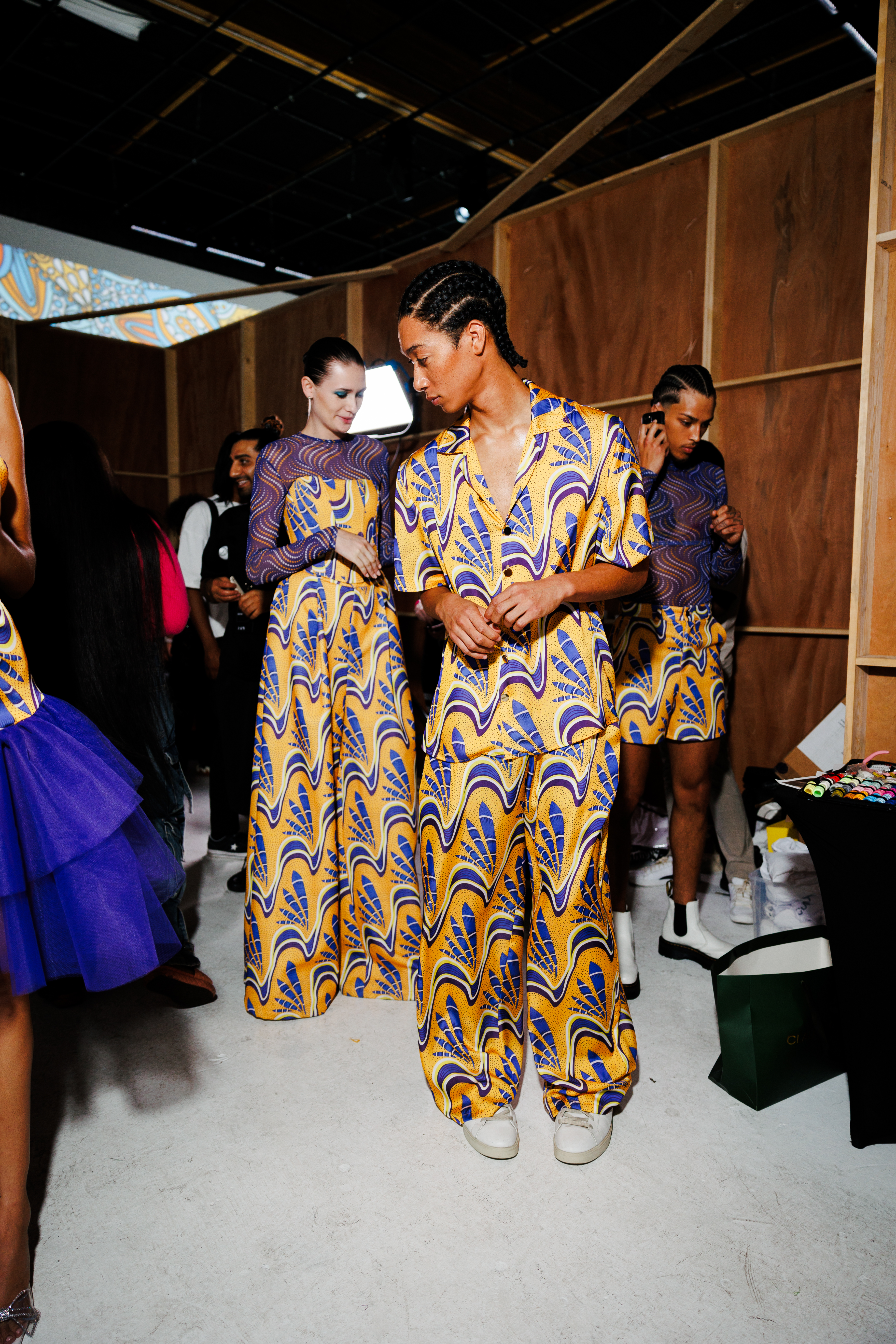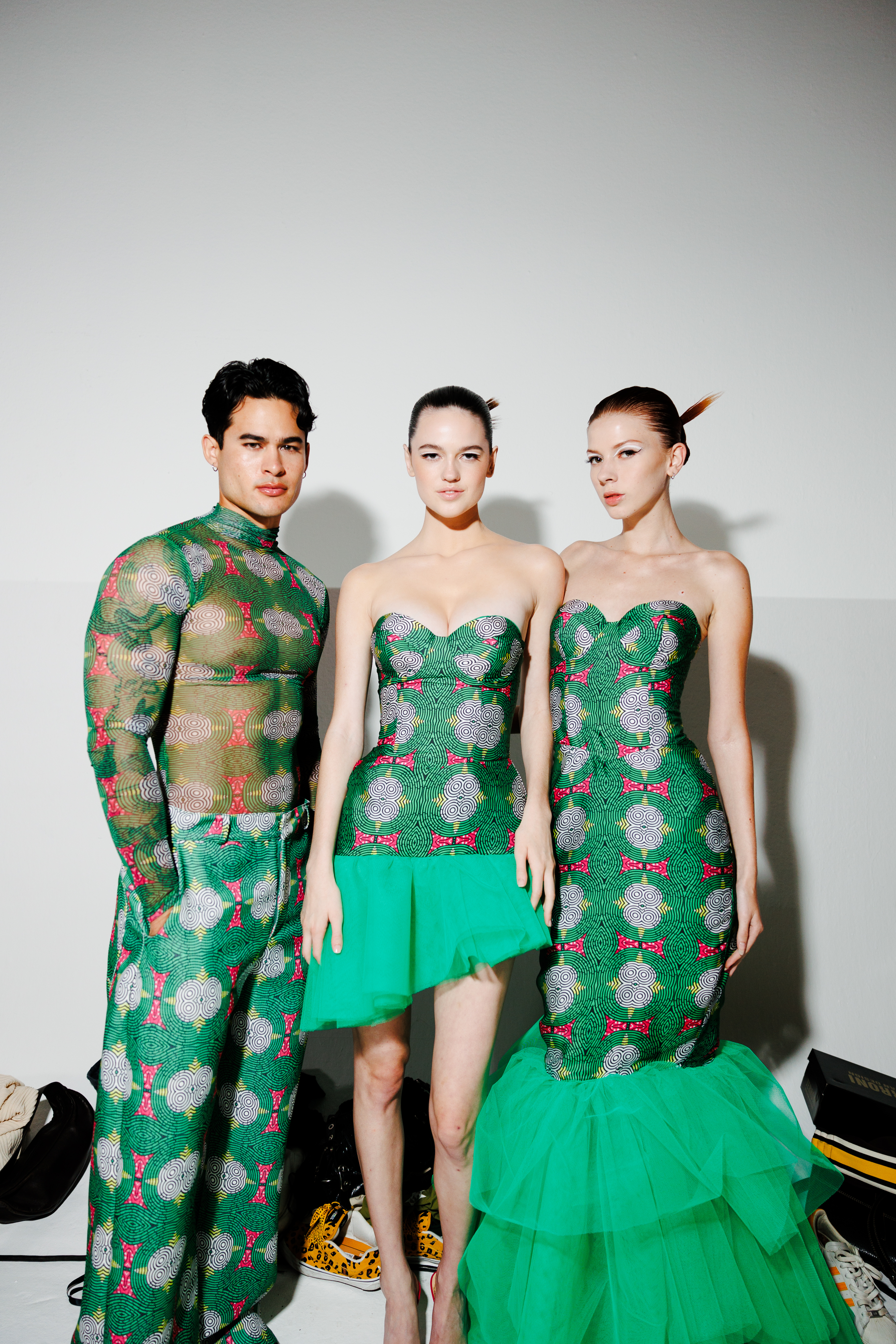Eyes followed a maxi dress of green and pink, shoulders crowned with tulle. More tulle spilled down in layers and layers of a drop-waist gown, an echo of the kaleidoscope along the venue’s walls. Those eye-catching prints are inspired by Kameni’s Cameroon Heritage. The designer was raised there before moving to the United States at eight years old.